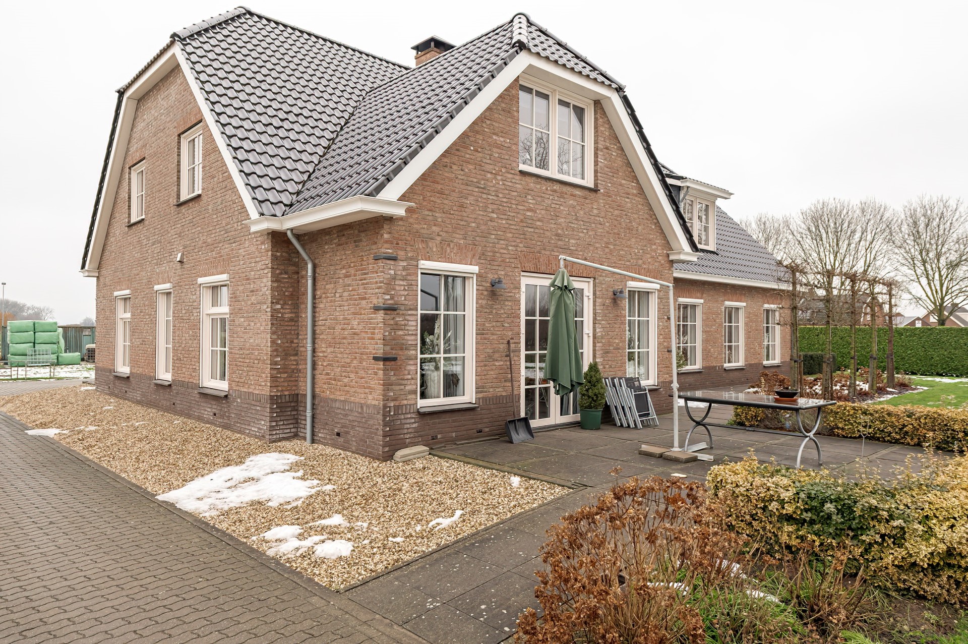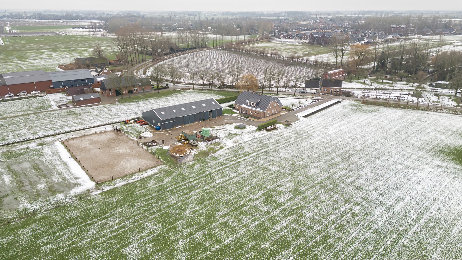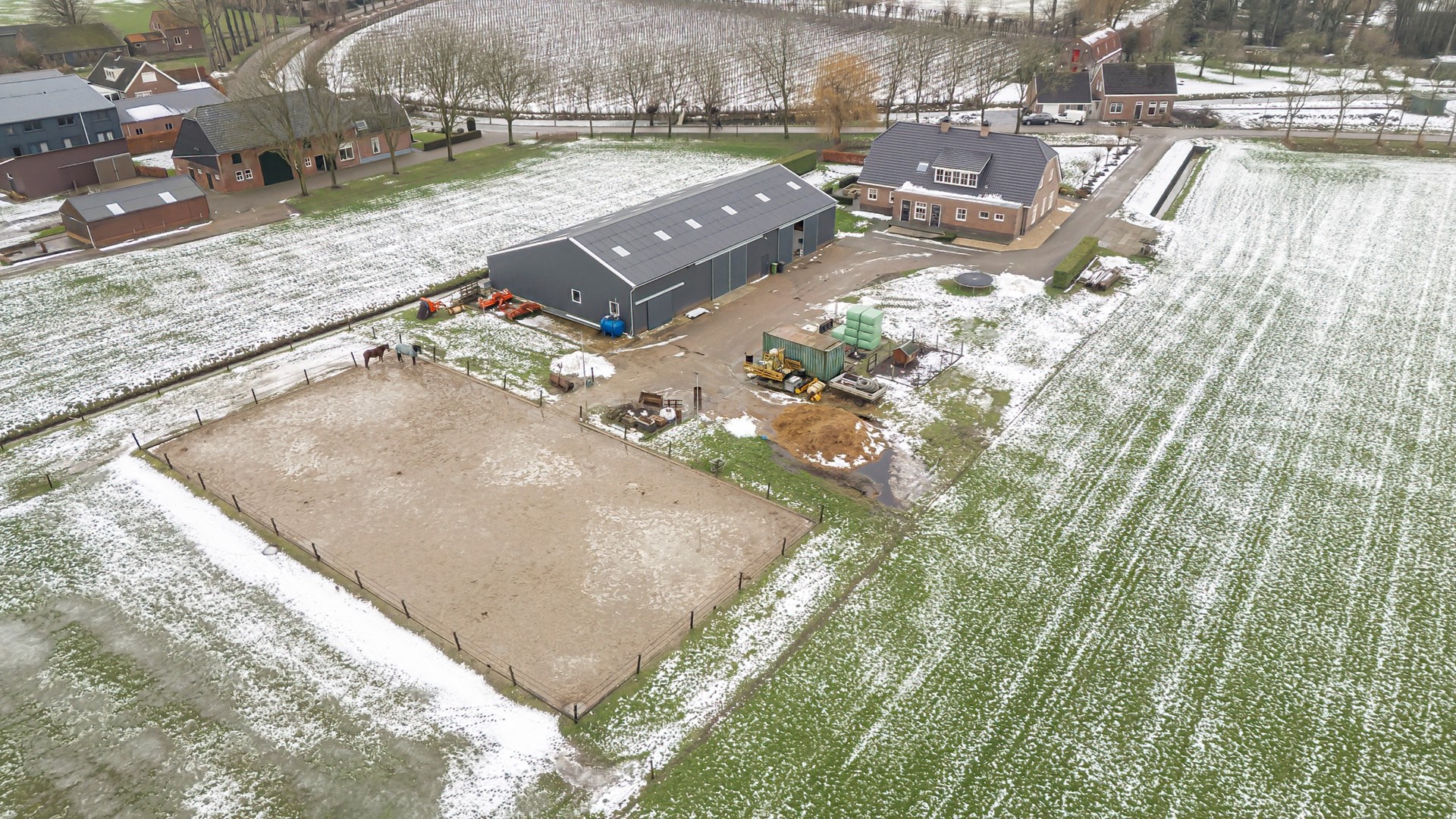 De woning is bereikbaar via een lange oprijlaan en wordt omgeven door een riante voortuin met gazon. Aan de zijkant van de woning ligt een terras waar je in alle rust kunt genieten van het buitenleven. Het geheel wordt compleet gemaakt door een paardenrijbak en een ruim perceel grond waar volop ruimte is voor het houden van paarden.