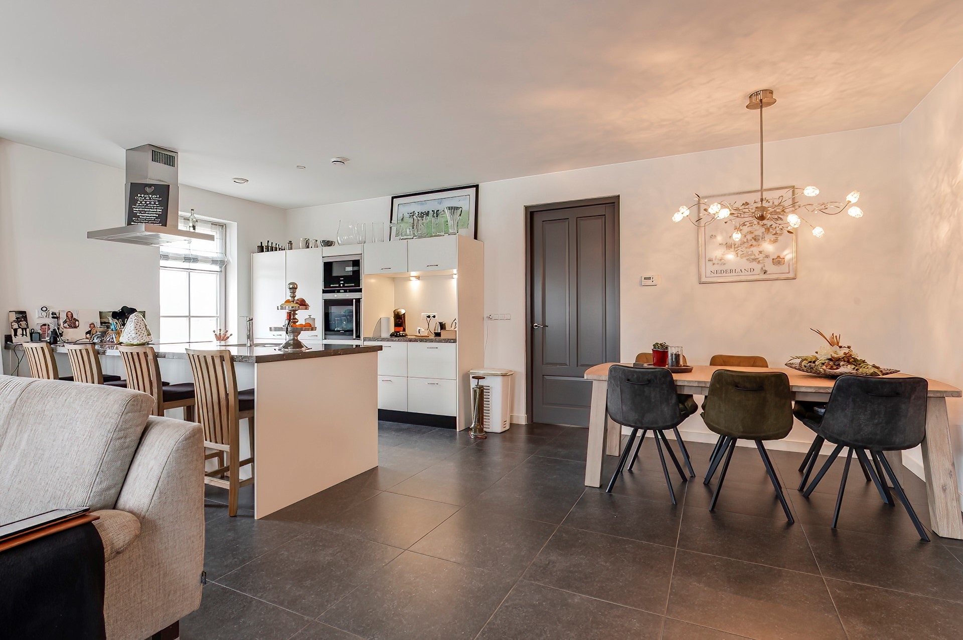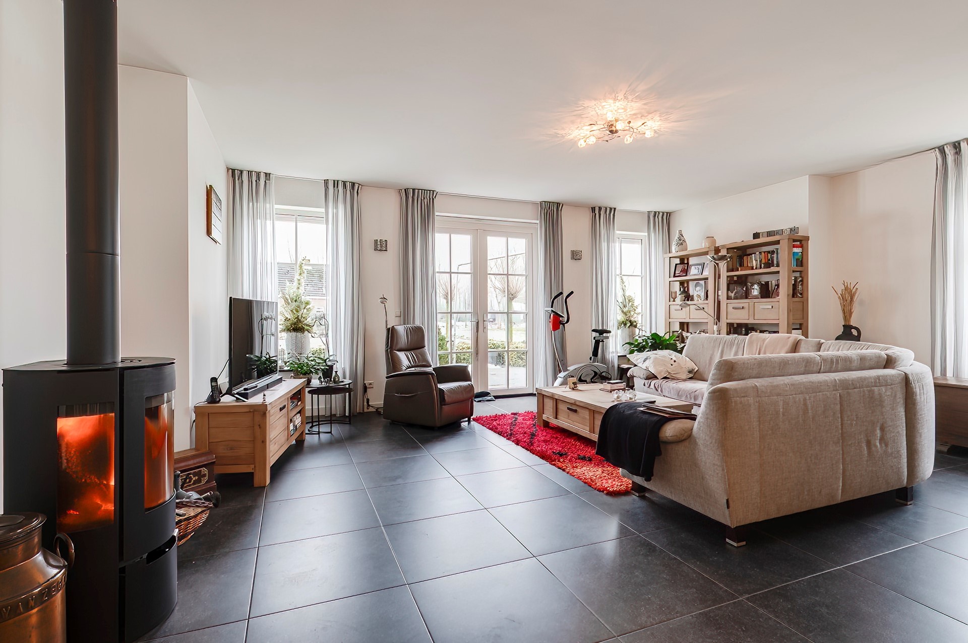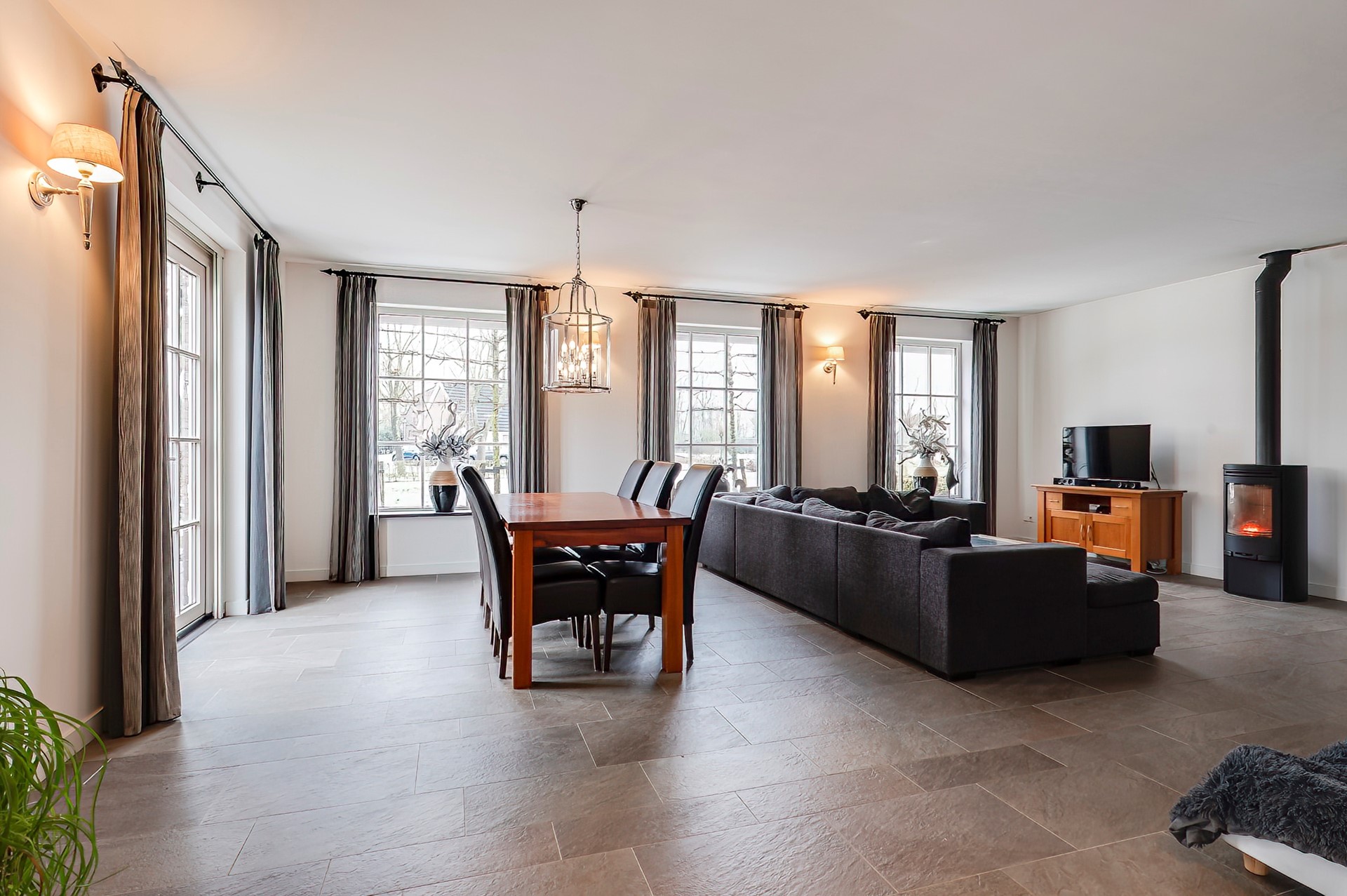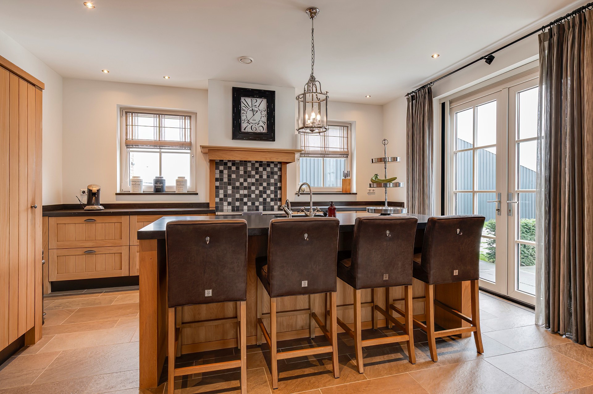 Ook in de woonkamer aan de rechterzijde zorgt een gezellige kachel voor extra warmte en sfeer. De keuken heeft een eiland, ideaal als extra werkruimte, ontbijtplek of om gezellig contact te houden met de woonkamer. Deze keuken is van alle gemakken voorzien en biedt directe toegang tot de tuin.