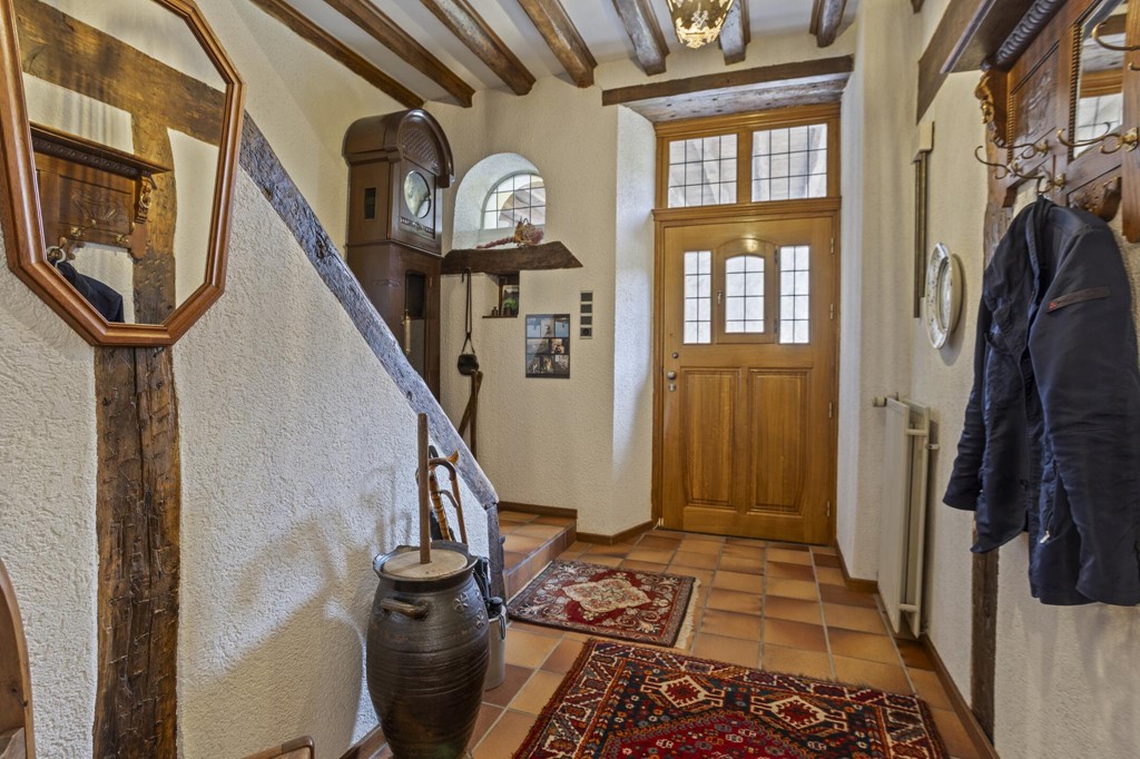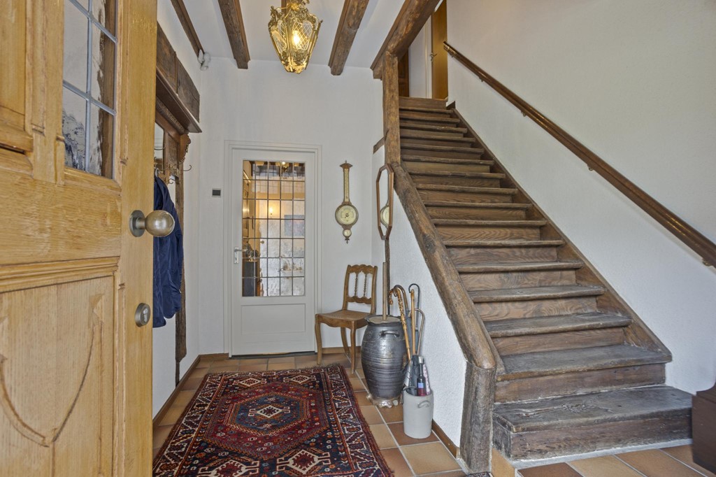 De landelijke sfeer van de woning is meteen merkbaar bij binnenkomst. De rustieke houten balken aan het plafond en in de muren, de wit grof gestucte muren en de karakteristieke houten trap geven het karakter van de woning weer. De entree geeft toegang naar de eet- en woonkamer. De tegelvloer loopt