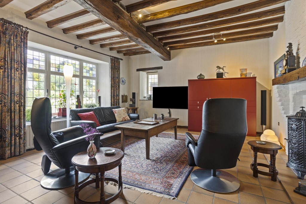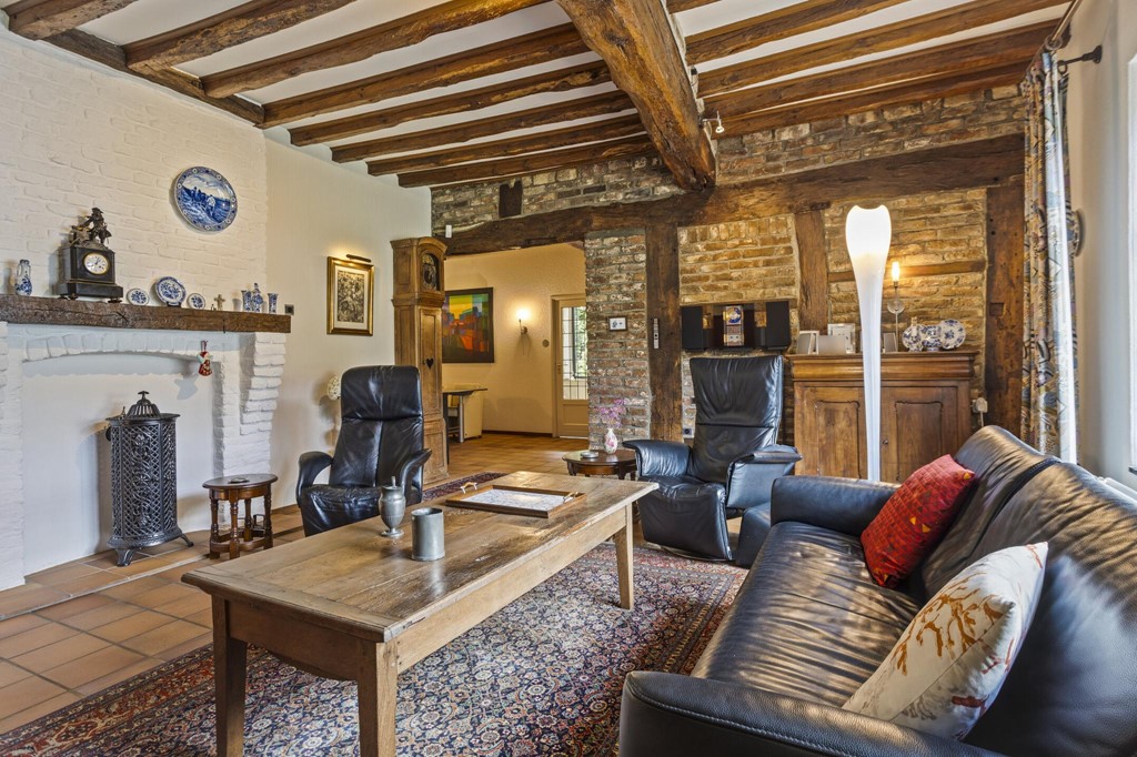 De knusse woonkamer is voorzien van een grote raampartij met authentieke glas-in-lood bovenramen wat een fraai zicht geeft op de binnenplaats en de kamer bovendien van veel licht voorziet. De schouw, schoonmetselwerk wanden en rustieke houten balken in het zicht zorgen ook hier weer voor
