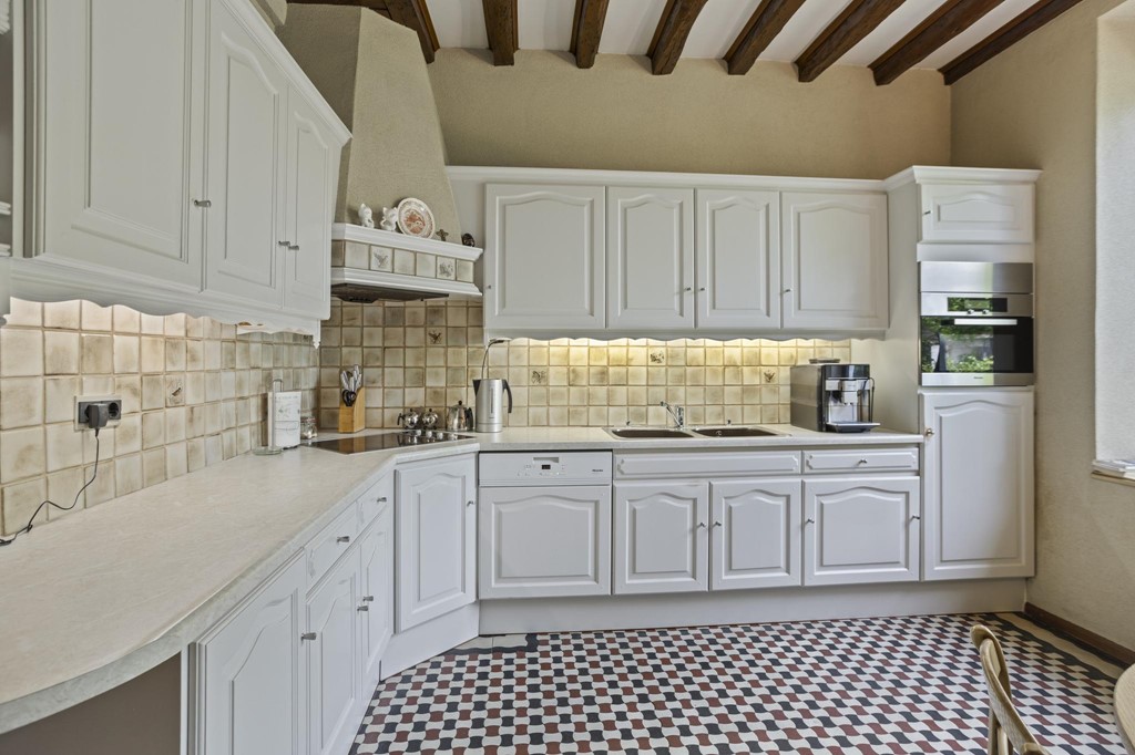 De lichte houten frontjes en aanrechtblad geven de ruimte een frisse uitstraling. In combinatie met de tegelvloer en rustieke houten balken is ook hier de landelijke charme van de woning zichtbaar. Vanuit de grote raampartij kijk je bovendien uit op de zijtuin en een stukje van de paardenstallen!