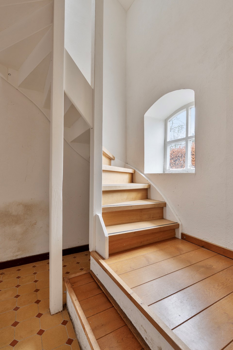 De woning beschikt over ruime en uitnodigende entree, afgewerkt met een tegeltjesvloer en deels schoonmetselwerk wanden, wat direct een warme en karakteristieke sfeer creëert. In de voordeur is een fraai glas?in?lood detail aanwezig dat zorgt voor extra charme en lichtinval. De trapopgang biedt toegang tot de ruime verdieping van de woning. De entree biedt tevens toegang tot een separaat toilet en urinoir, beide geheel betegeld en voorzien van een fonteintje.