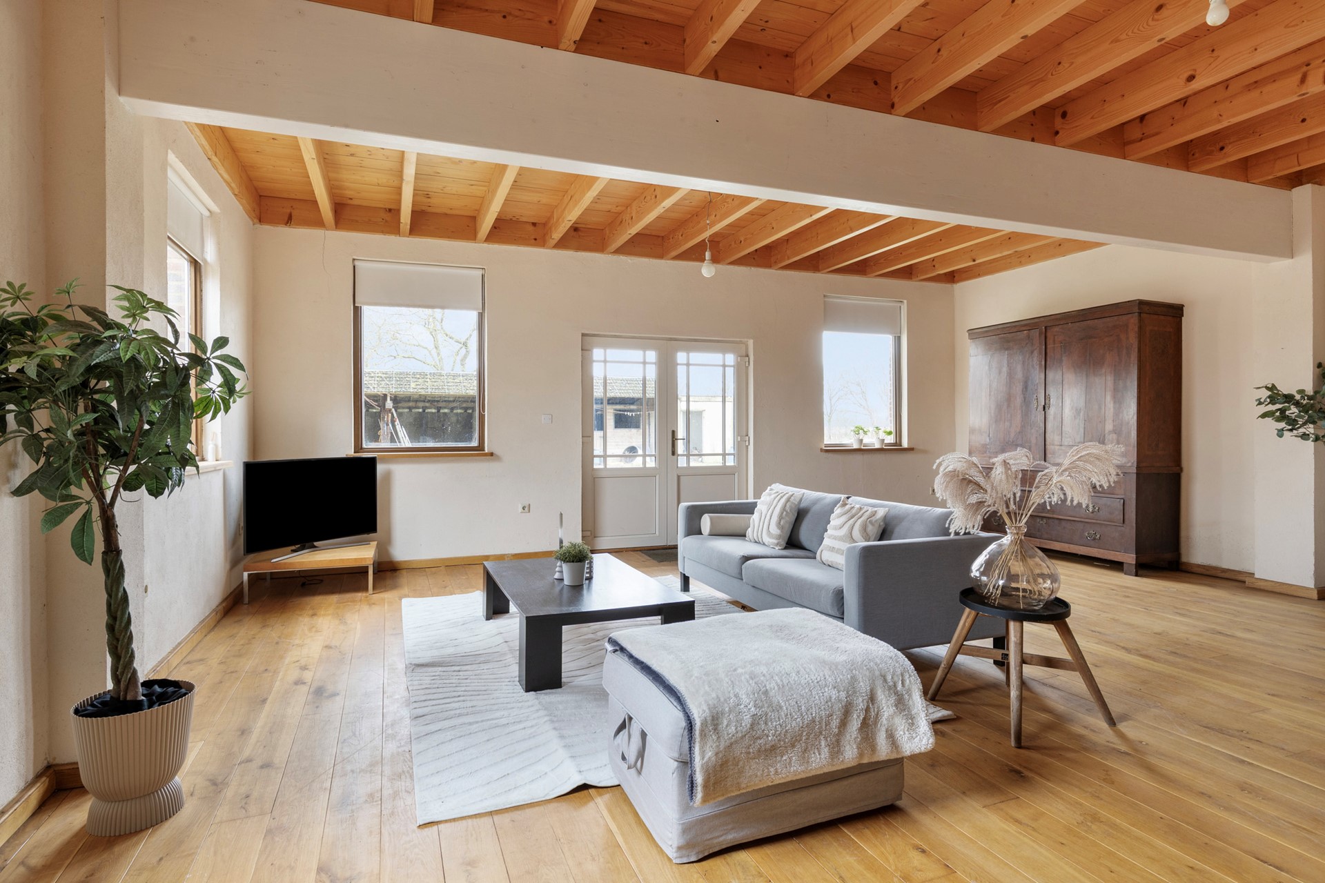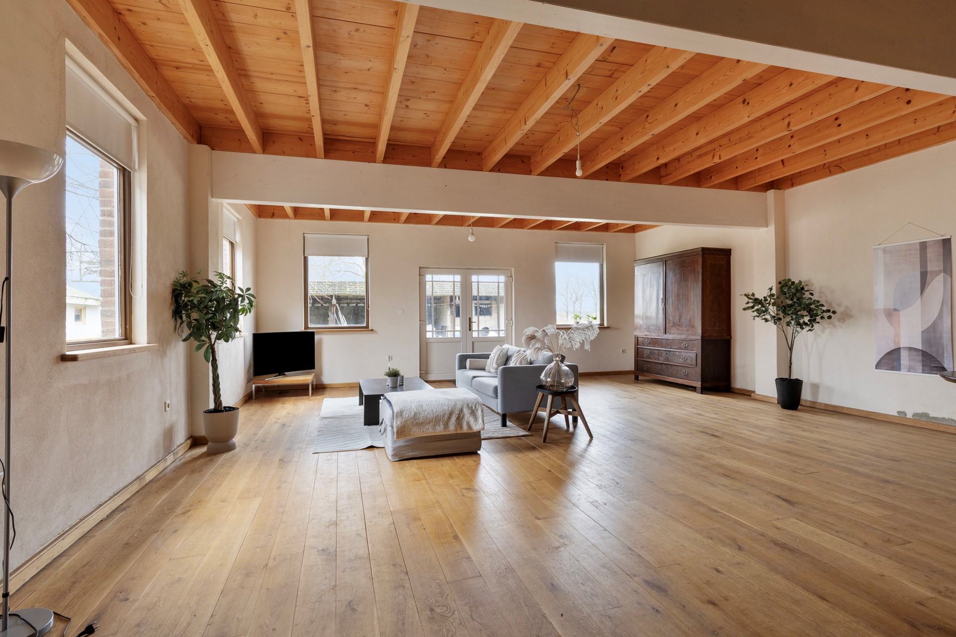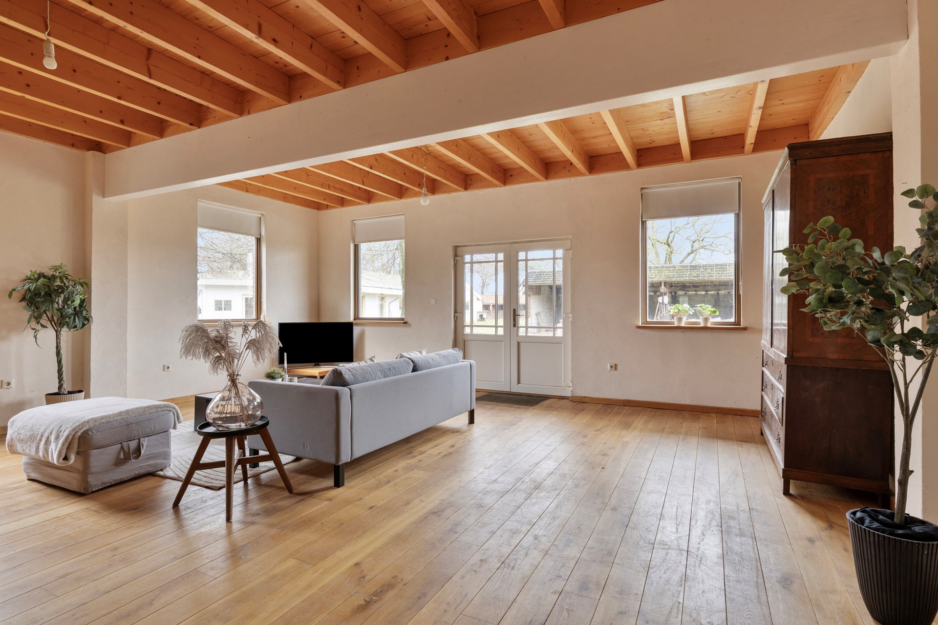 De woonkamer is een lichte en sfeervolle leefruimte met uitzicht op het erf en de paardenstallen. Dankzij de ruime opzet biedt de kamer volop mogelijkheden voor zowel een comfortabele zithoek als een royale eettafel. De raampartijen en openslaande deuren zorgen voor een aangename daglichtinval en creëren een open en uitnodigende sfeer.