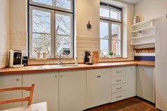 De bijkeuken is voorzien van een praktisch keukenblok met aansluitingen voor witgoed. Een grote ingebouwde kastenwand biedt volop praktische opbergruimte. Vanuit de bijkeuken is zowel de keuken als de kelder direct toegankelijk. Ook is hier de meterkast gesitueerd. Daarnaast beschikt de bijkeuken over een achterom, waardoor deze ruimte ideaal functioneert als achterentree.