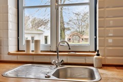 De landelijke keuken is ingericht met een 4?pits elektrische kookplaat met bijbehorende afzuigkap en biedt veel werkruimte dankzij het ruime aanrechtblad. Vanuit de keuken is er fraai zicht op het achtererf en de paardenstallen, wat een prettig gevoel van ruimte en verbondenheid met het buitenleven geeft.