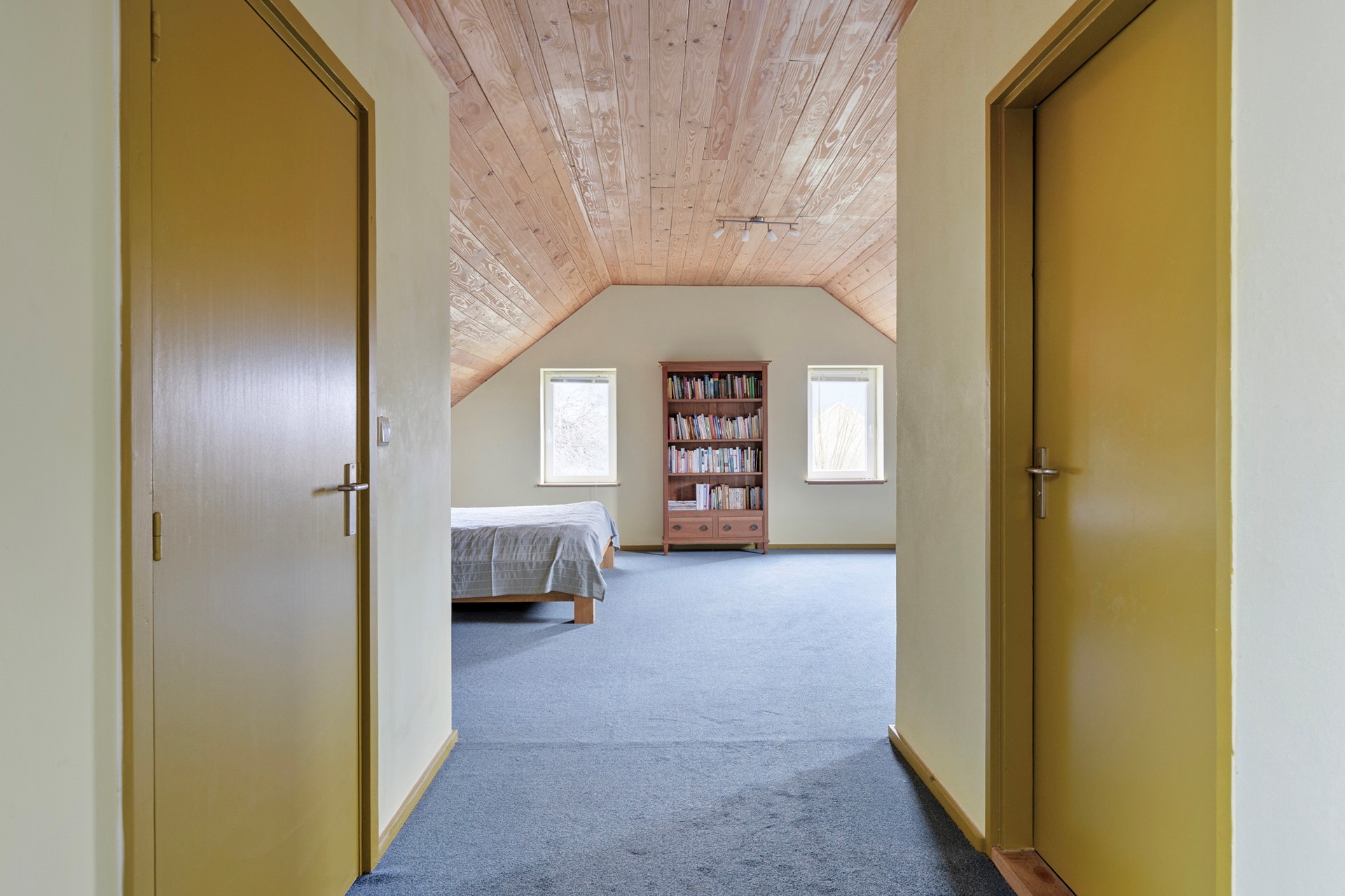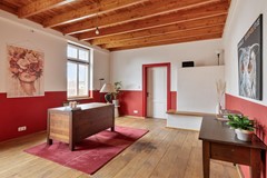 De studeerkamer fungeert als een rustige en comfortabele werkruimte, ideaal voor thuiswerken, administratie of studie. De kamer is ingericht met een grote, ingebouwde boekenwand, die niet alleen zorgt voor veel opbergruimte maar ook direct een warm en stijlvol karakter aan de ruimte geeft. Dankzij de royale opzet is er voldoende plaats voor een bureau of extra zitplek, waardoor deze kamer veelzijdig te gebruiken is.