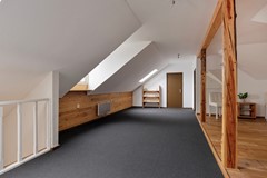 De verdieping van de woning biedt een indrukwekkend gevoel van ruimte dankzij de extra brede overloop die zich over bijna de volledige lengte van het huis uitstrekt. De vloer is voorzien van vloerbedekking en de wanden zijn strak gestuct. Een bijzonder detail is de houten vlonder met een gezellig zitje. Deze sfeervolle hoek vormt een ideale plek om te ontspannen. De overloop biedt toegang tot een slaapkamer met badkamer ensuite, een tweede ruime slaapkamer, een separate badkamer en drie kleinere slaapkamers.