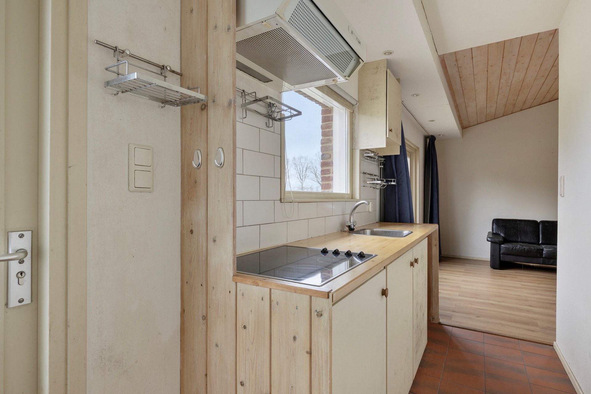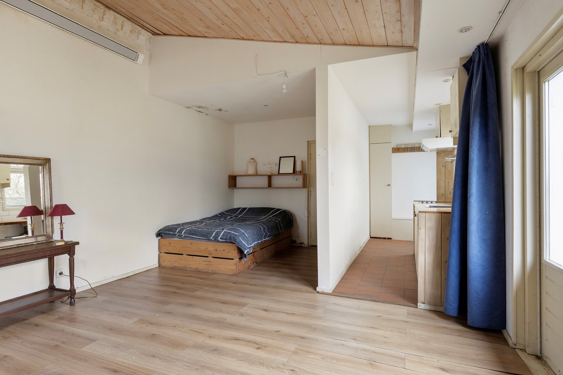 Het appartement beschikt over een eenvoudig keukenblok, voorzien van een 4-pits elektrische kookplaat met afzuiging en een spoelbak. De woonkamer en het slaapgedeelte bevinden zich in één open ruimte, waardoor een efficiënt en gezellig studio?achtig geheel ontstaat. De openslaande deuren geven