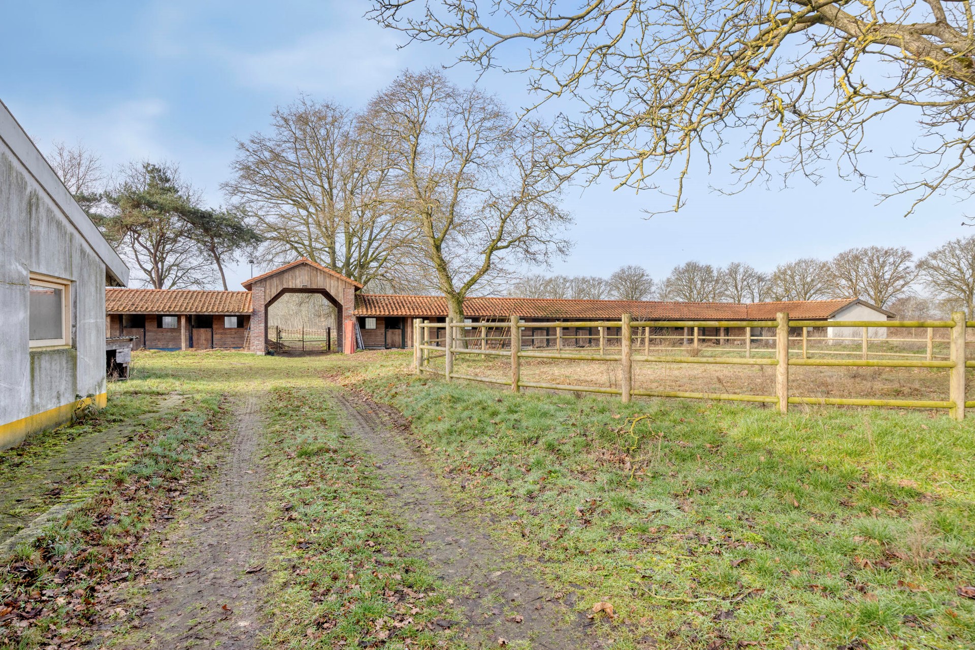 Centraal in het U?vormige gebouw bevindt zich een karakteristieke middendoorgang, van waaruit zowel de buitenrijbak als de aangrenzende weides direct bereikbaar zijn. Op het erf bevindt zich daarnaast een verlichte longeercirkel, waardoor trainen ook in de avonduren eenvoudig mogelijk is.