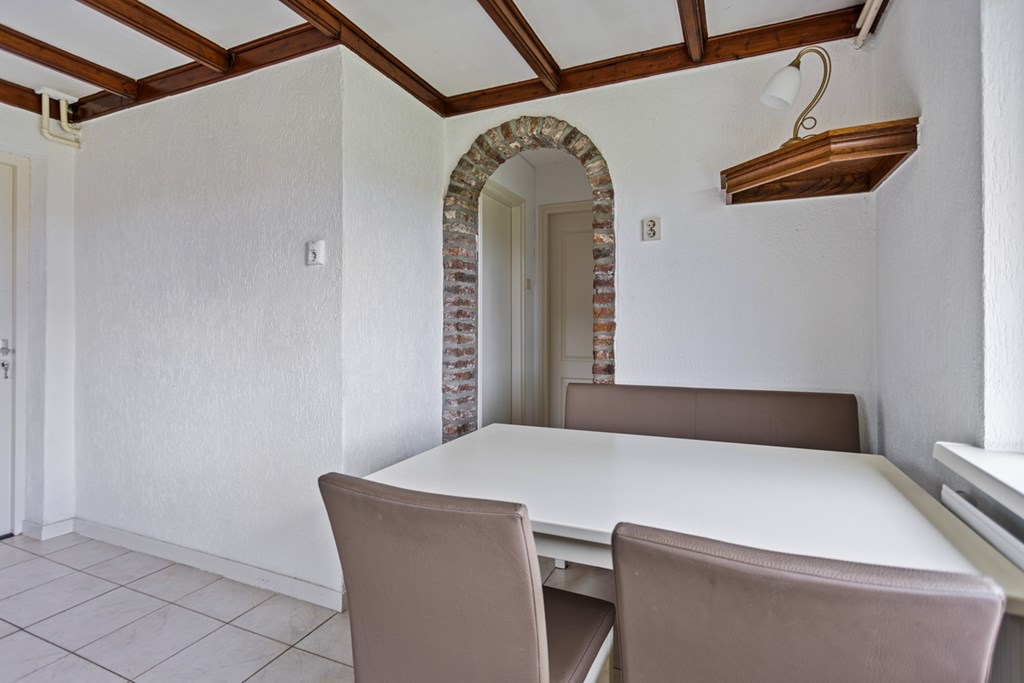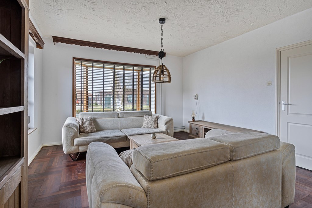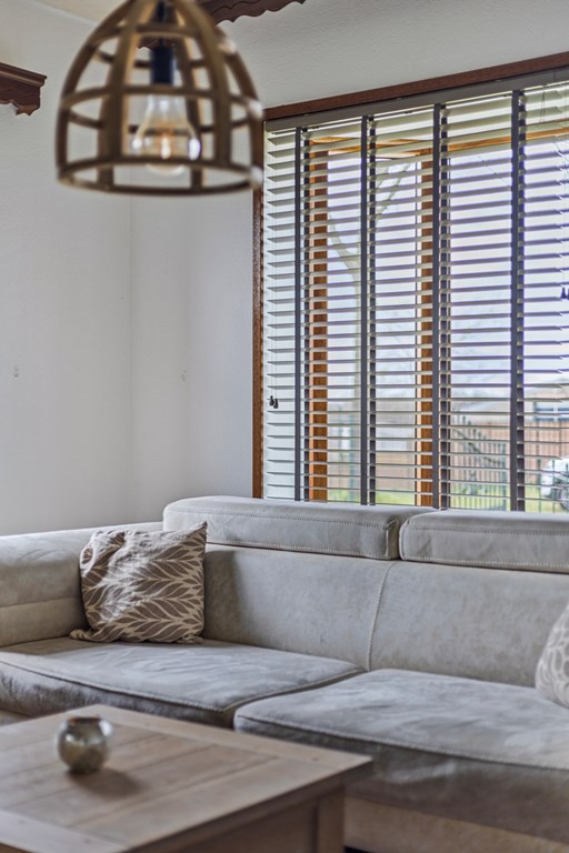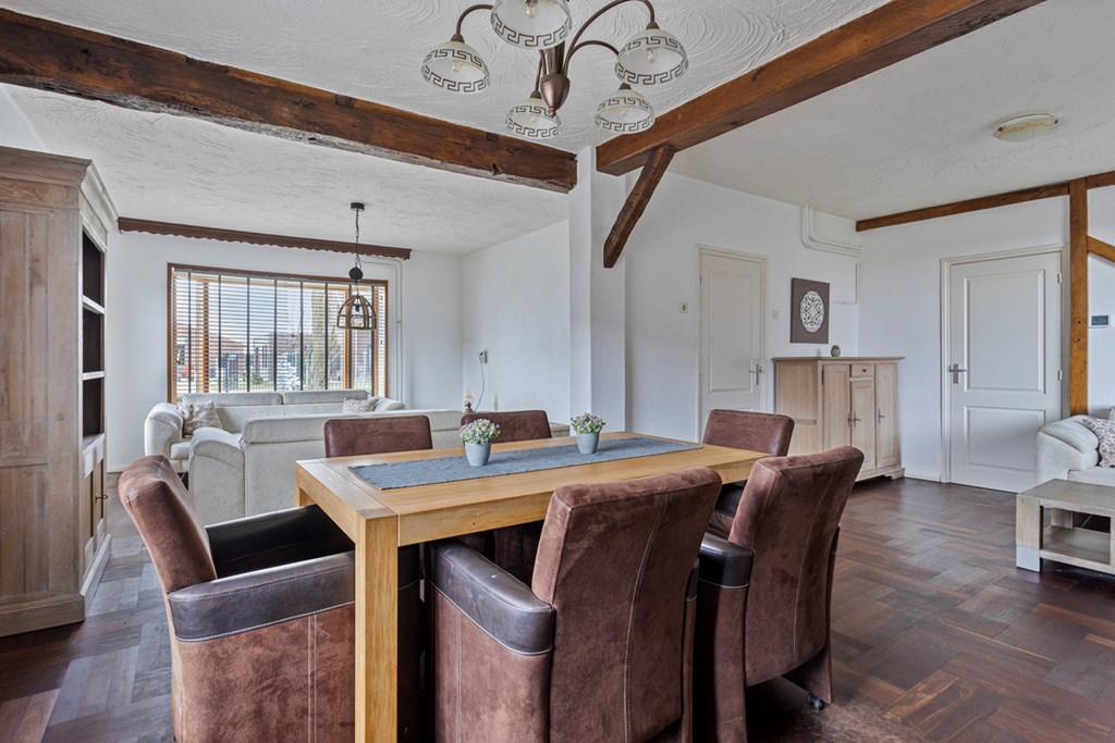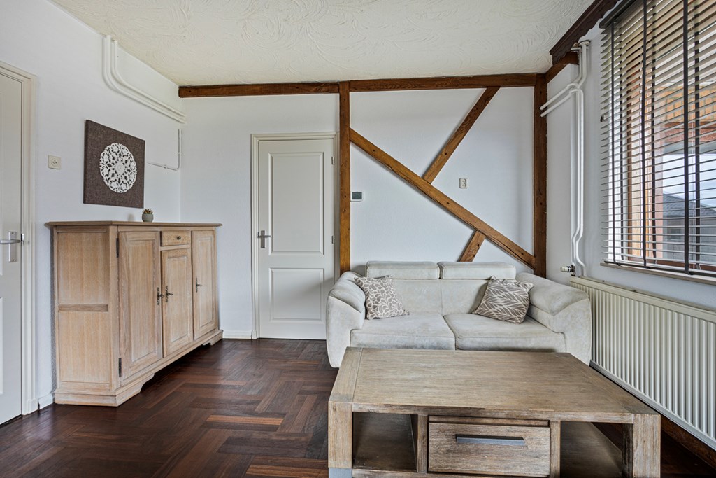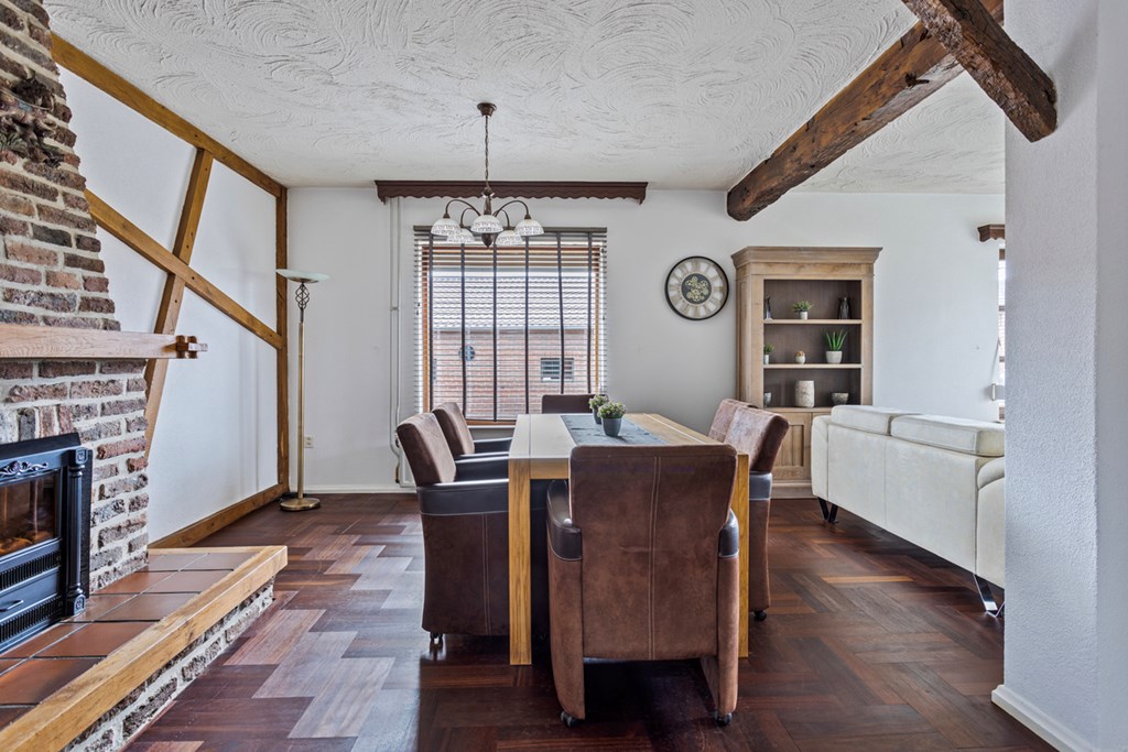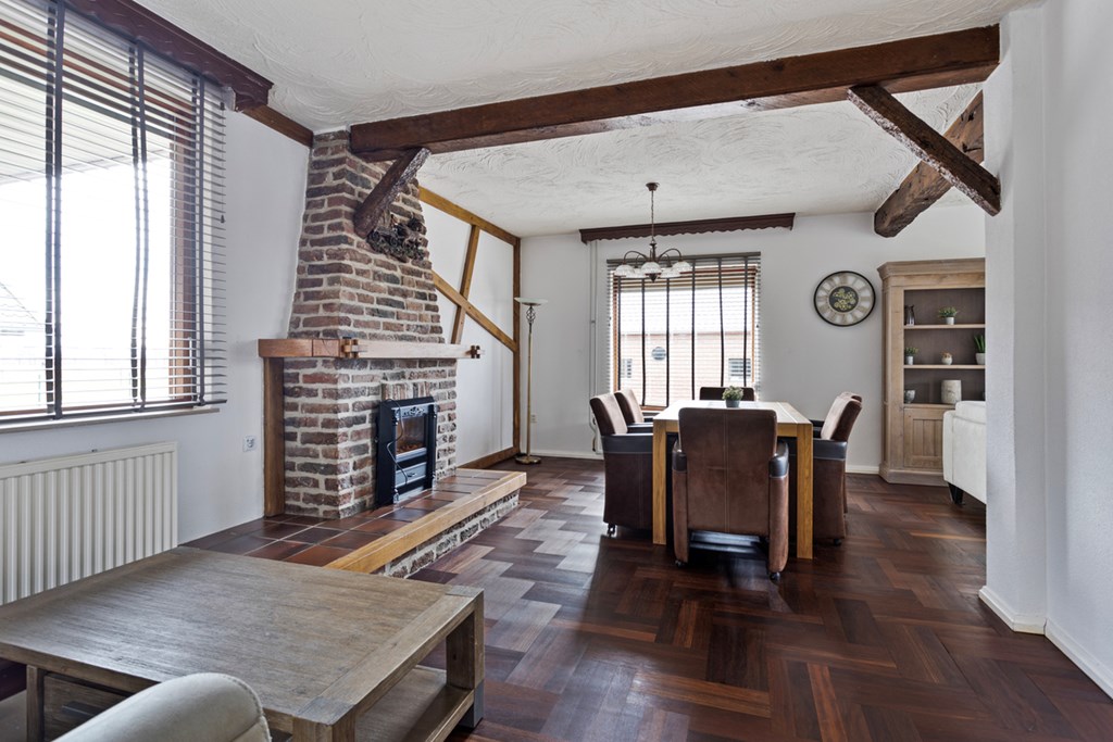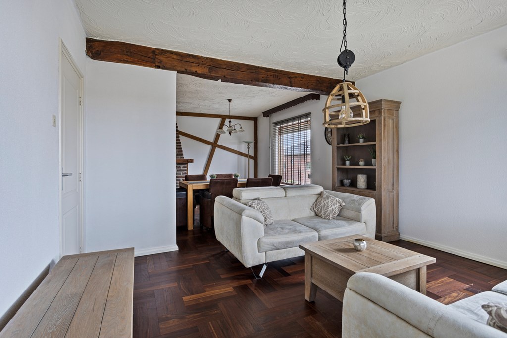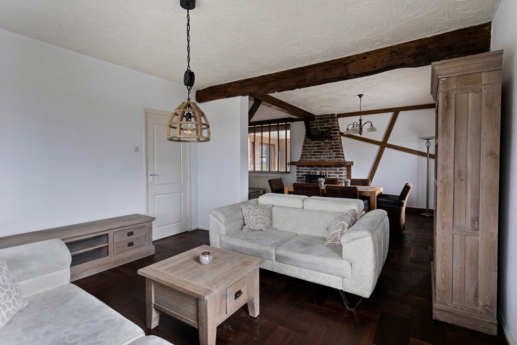 De L-vormige woonkamer beschikt over een elektrische haard met schouw deze tezamen met de houten balken voor een landelijke sfeer zorgt. De woonkamer is afgewerkt met een parketvloer van donker hardhout en de muren zijn voorzien van stucwerk. De grote raampartijen zorgen bovendien voor veel natuurlijke lichtinval. Vanuit de woonkamer is via een tussenportaal het separaat toilet en de badkamer bereikbaar en is er toegang naar de keuken.