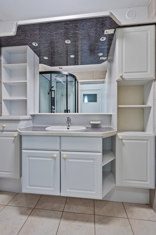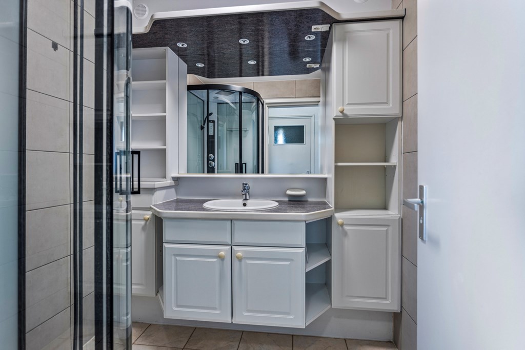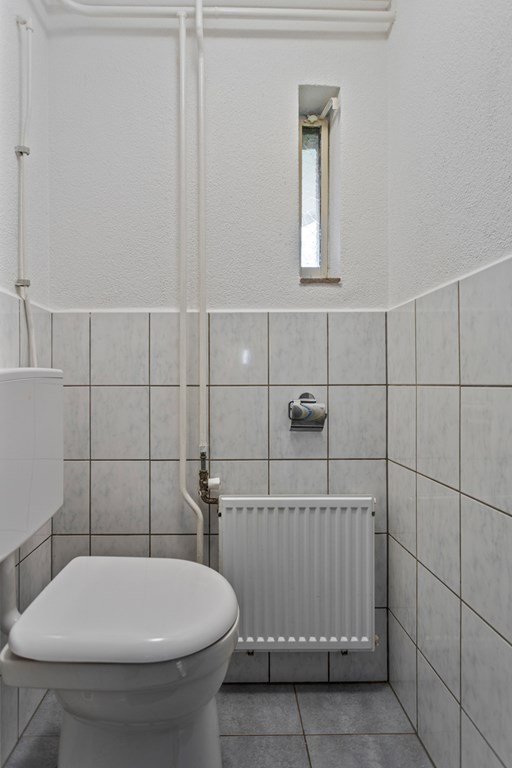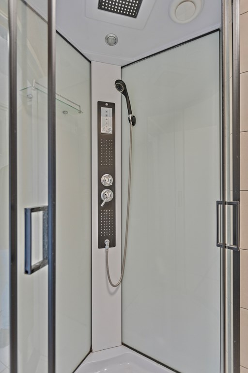 De toiletruimte met staand closet is half betegeld. De badkamer is geheel betegeld en beschikt over een douchecabine met een douchepaneel met massagespots en wastafel met meubel.