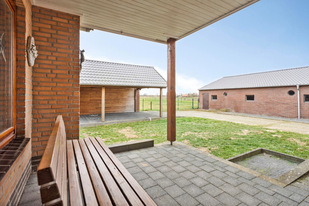 De locatie is aan de voorzijde voorzien van een gazon en is volledig omheind met mooi sierhekwerk en haag met diverse toegangspoorten. Aan de voorzijde heeft u tevens toegang tot de parkeerplaatsen en de loods. Achter het woonhuis bevindt zich nog een mooie overdekte buitenruimte/terras carpoort (ca. 12m x 4m) incl. afsluitbare ruimte voor de tuinmeubels (ca. 4m x 4m).