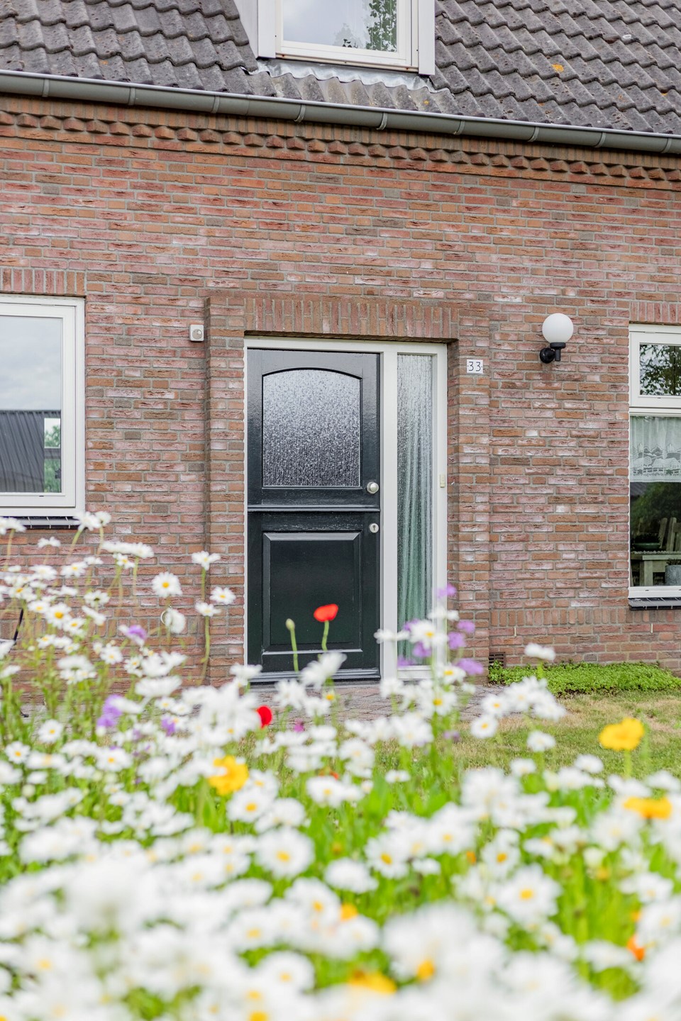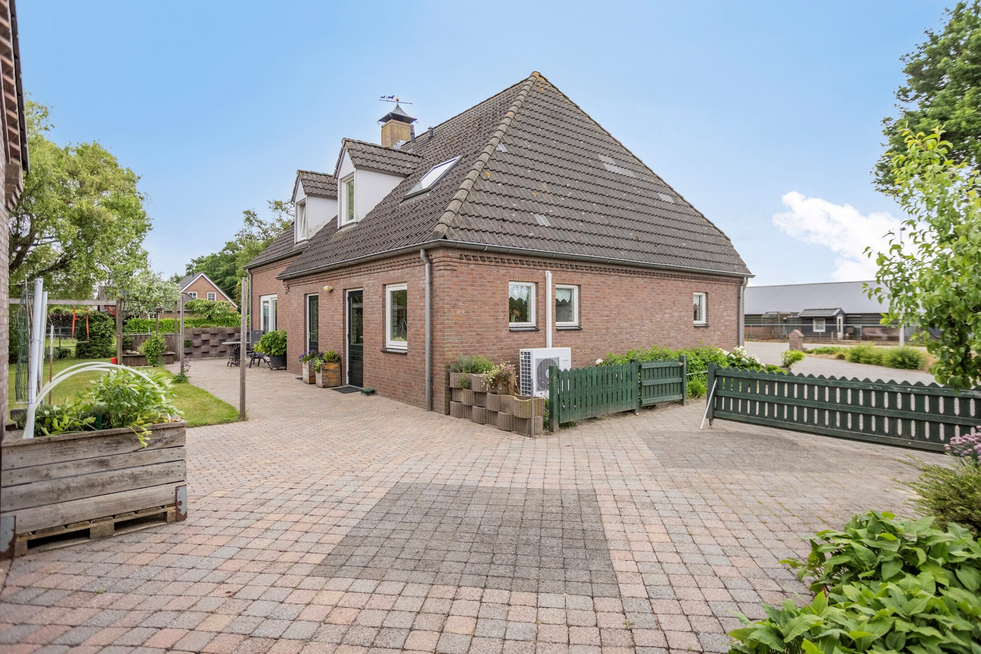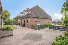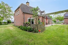 De verzorgde tuin is ingericht met bestrating, terras, gazon en borders met beplanting en bomen. Het beklinkerde terras staat in directe verbinding met de woonkamer via een schuifpui. Vanaf hier geniet je van een prachtig vrij uitzicht over de tuin en de weide.