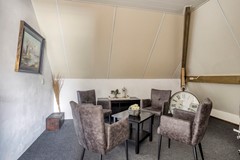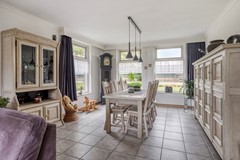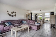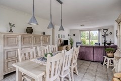 De woonkamer met eethoek is voorzien van strak gestucte wanden en een plafond met een fraaie sierlijst. Grote ramen zorgen voor een aangename lichtinval en bieden een vrij uitzicht. De woonkamer grenst direct aan de keuken, wat zorgt