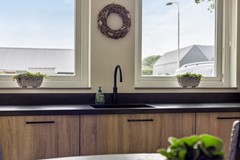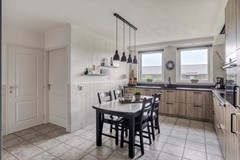 De smaakvolle woonkeuken (2023) is uitgerust met een L-vormig keukenblok voorzien van een keramisch aanrechtblad met wasbak en Quooker-kraan. Daarnaast beschikt de keuken over een 4-pits inductiekookplaat, afzuigkap, combimagnetron, vaatwasser en koelkast. Een ruime provisiekast biedt volop ruimte voor het opbergen van voorraad. De keuken is direct verbonden met de achter-entree.