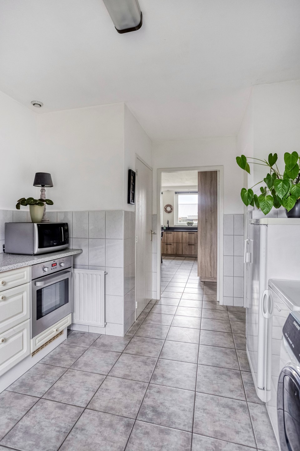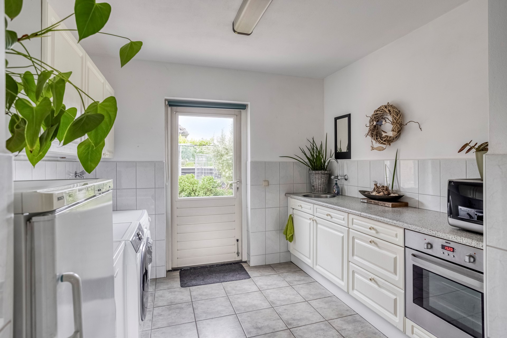 De deels betegelde bijkeuken, met achterdeur naar het terras, is voorzien van een praktisch keukenblok met elektrische oven. In deze ruimte bevinden zich ook de aansluitingen voor het witgoed en de toegang tot het volledig betegelde