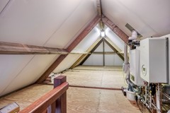 Via een vaste trap bereik je de zolder met volop bergruimte.Hier bevinden zich de cv-ketel, de warmtepompunit en de installatie voor de mechanische ventilatie.