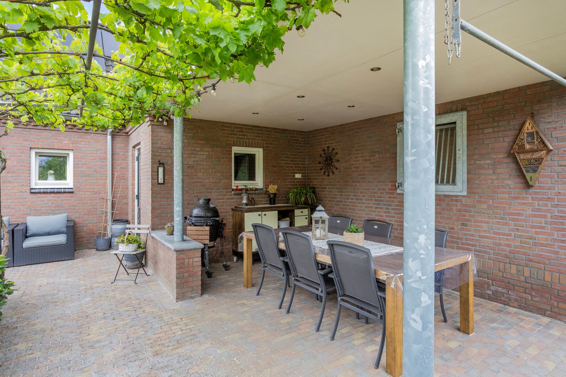 Aan de schuur is een fraaie, privacyrijke veranda gerealiseerd, voorzien van een beklinkerd terras. Geïntegreerde spotverlichting in het plafond zorgt ’s avonds voor een warme sfeer. De veranda grenst direct aan de weide en het hondenverblijf. Hier kunt u volop genieten van het uitzicht én het buitenleven. Of u nu liever de zon opzoekt of juist de schaduw verkiest, er is altijd een comfortabel plekje te vinden.