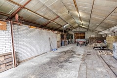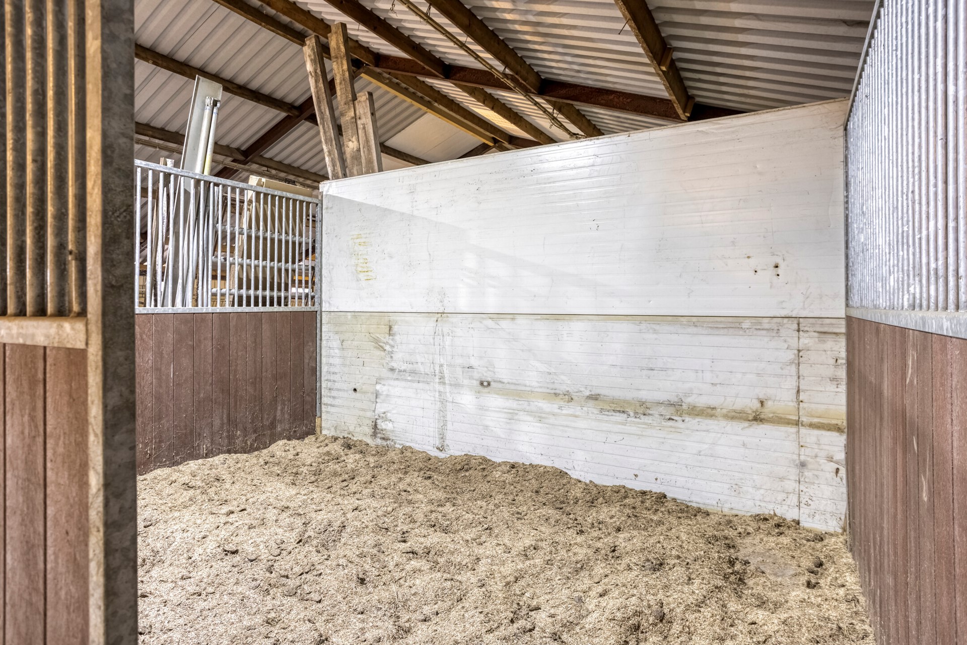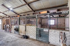 Achter de woning bevindt zich een ruime goed geïsoleerde schuur (2006) met grote rolpoort, twee paardenboxen en een aparte entree. Deze entree is praktisch ingericht met een aanrecht voorzien van twee wastafels en extra kastruimte.