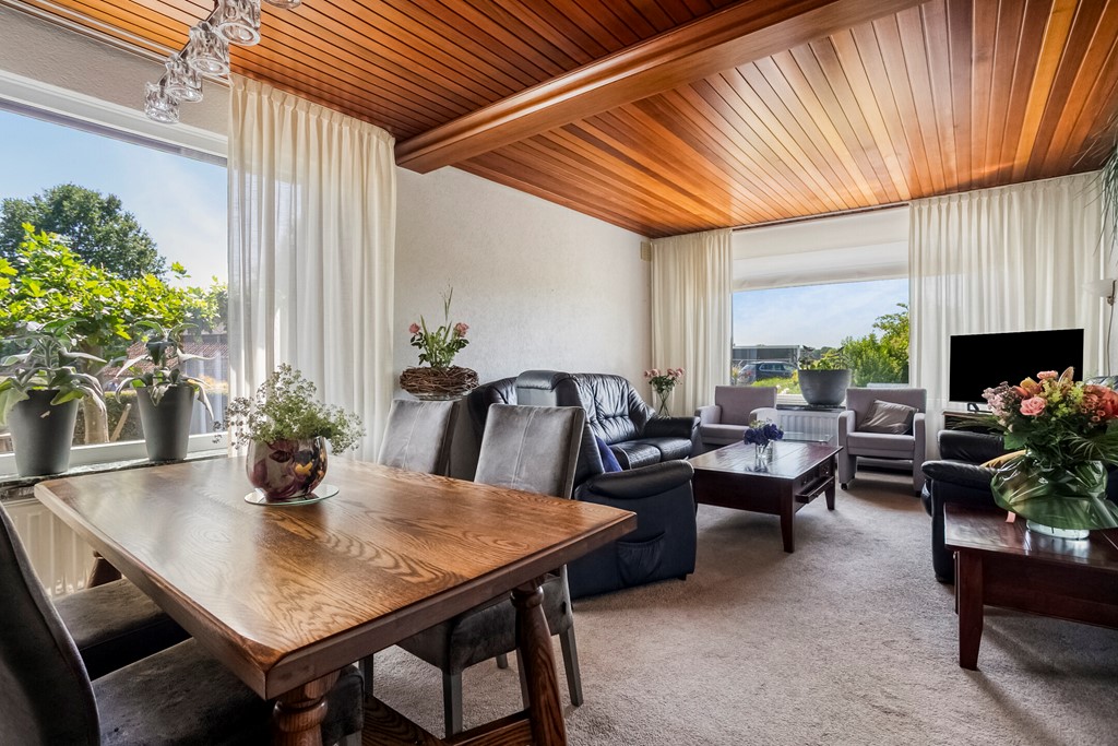 De grote raampartijen in deze knusse woonkamer bieden een vrij uitzicht op de fraaie voor- en zijtuin en maken deze ruimte heerlijk licht. De kamer is afgewerkt met een vloerbedekking en granol stucwerk wanden. Het plafond bestaat uit houten schrootjes.