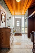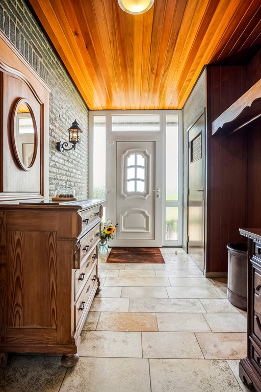 De fraai aangelegde voortuin brengt je naar de voordeur van de woning. De lichte entree heeft een tegelvloer en is afgewerkt met schoonmetselwerkwanden en deels granol stucwerk. Hier bevindt zich de meterkast, een garderobenis en het geheel betegelde toilet met fonteintje.