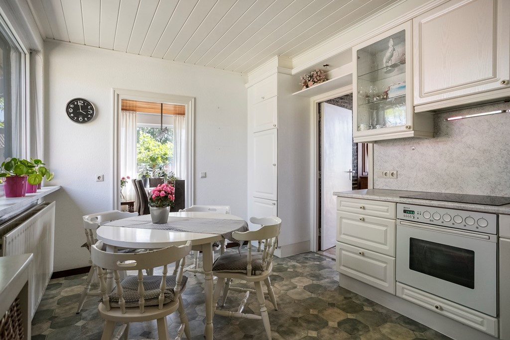 De keuken heeft een praktische hoekopstelling en is voorzien van de benodigde apparatuur, o.a. een oven, vaatwasser, 4-pits inductiekookplaat met afzuigkap, koelkast en een magnetron. De lichte houten frontjes geven de ruimte een frisse, tijdloze uitstraling. Bovendien is er voldoende ruimte voor een gezellige eettafel.