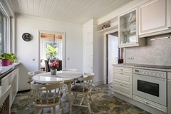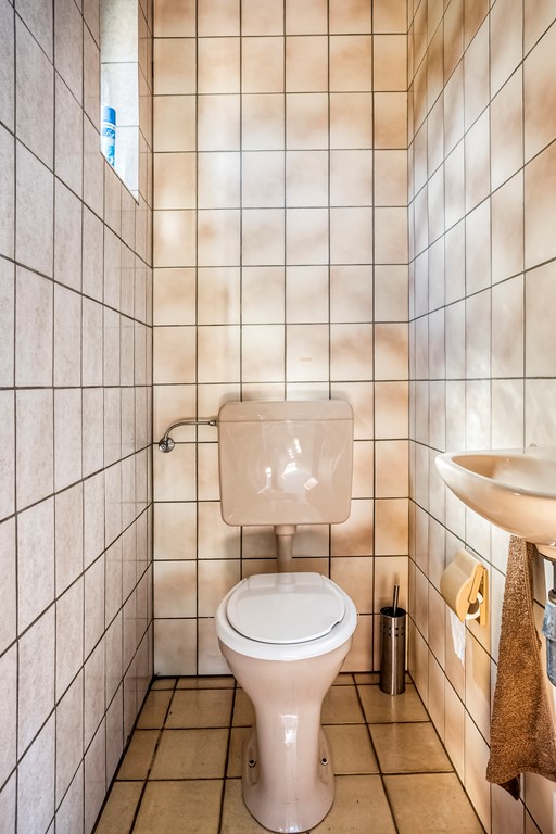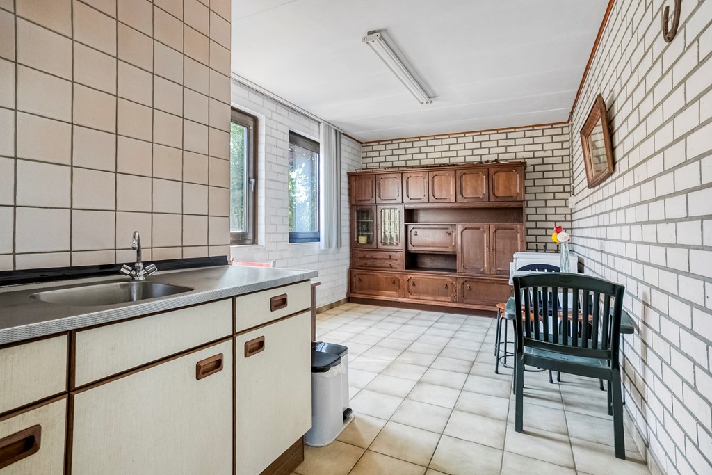 De praktische bijkeuken, grenzend aan de keuken, voorziet in een keukenblokje, de aansluiting voor het witgoed en een bergkast. De ruimte is afgewerkt met een tegelvloer en schoonmetselwerkwanden. Bovendien biedt de achterdeur directe