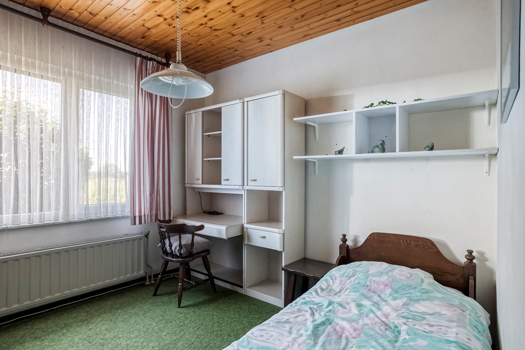 De hal vanuit de entree van de woning geeft vervolgens toegang tot drie slaapkamers en de badkamer. Ook is in de hal de vlizotrap te vinden naar de ruime bergzolder waar de c.v.-ketel is gesitueerd. De eerste slaapkamer aan de linkerzijde is afgewerkt met een vloerbedekking, gestucte wanden, houten schrootjes plafond. Een tweede slaapkamer aan de achterzijde is in dezelfde stijl afgewerkt. Ook hier zorgt de grote raampartij voor veel prettig lichtinval. Beide slaapkamers beschikken over een muurkast.