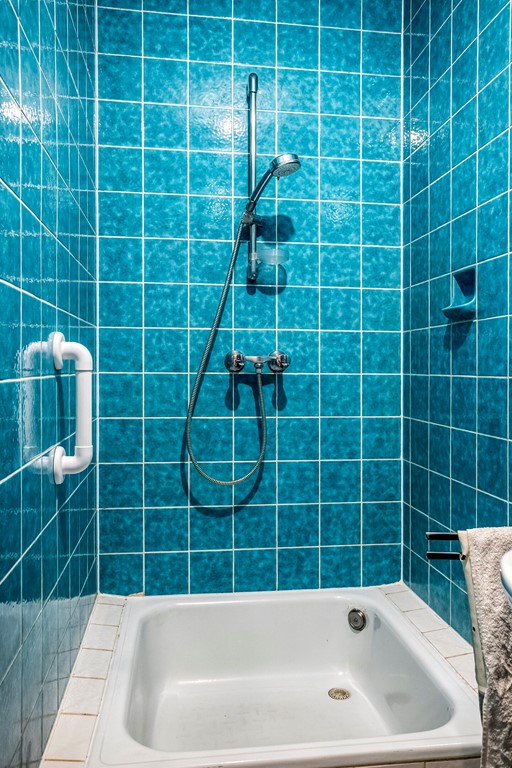 De frisse blauwe tegeltjes in de badkamer geven de ruimte een levendige uitstraling, terwijl de eenvoudige indeling met douche en wastafel zorgt voor optimaal gebruik van de beschikbare ruimte. De badkamer is voorzien van mechanische ventilatie.