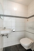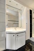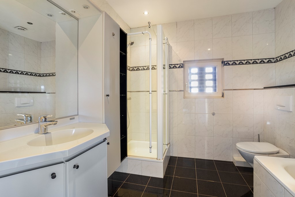 De badkamer is ruim van opzet en uitgevoerd met een tegelvloer en volledig betegelde wanden. De ruimte wordt verwarmd middels vloerverwarming en is ingericht met een inloopdouche, ligbad, vaste wastafel en een zwevend toilet.