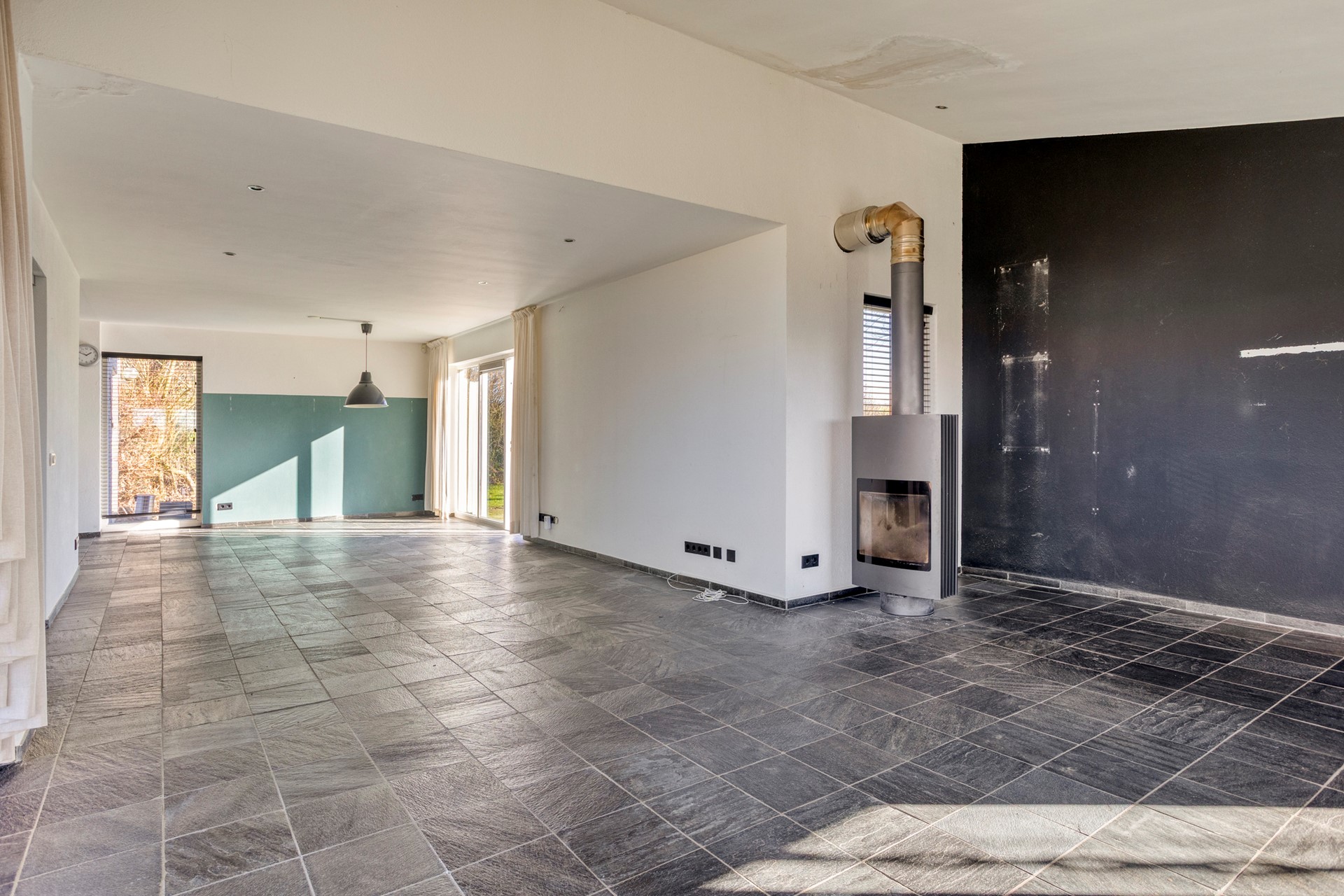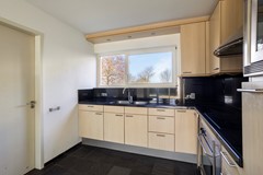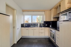De ruim opgezette L-vormige woonkamer geniet van veel natuurlijk licht dankzij de speelse raampartijen aan de voorzijde van de woning. De ruimte is voorzien van een leistenen vloer met vloerverwarming en strak gestucte wanden. Tijdens de bouw zijn diverse plafondhoogtes gecreëerd, wat zorgt voor een bijzondere ruimtelijke beleving. Daarnaast zijn in de plafonds inbouwspots verwerkt, die de woonkamer voorzien van een rustige en sfeervolle verlichting. Op de hoek van de woonkamer is een draaibare houtkachel geplaatst. Deze kan eenvoudig in diverse richtingen worden gedraaid, zodat vanuit meerdere zit- en leefhoeken kan worden genoten van de warmte en sfeer van het haardvuur. Aangrenzend bevindt zich de open keuken, waardoor er een prettig en open leefgedeelte ontstaat.