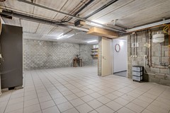 Via de hal zijn zowel de kelder als de garage toegankelijk. De kelderhal is afgewerkt met dezelfde leistenen vloer en strak gestucte wanden als op de begane grond. De L-vormige ruime garage is voorzien van een tegelvloer. De kelderwanden zijn opgetrokken uit schoonmetselwerk van betonstenen. De garage beschikt over een elektrische garagepoort en biedt ruimte aan de CV-ketel (Nefit Trendline uit ca. 2022), de toegang tot de kruipruimte en de verdeler van de vloerverwarming.