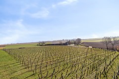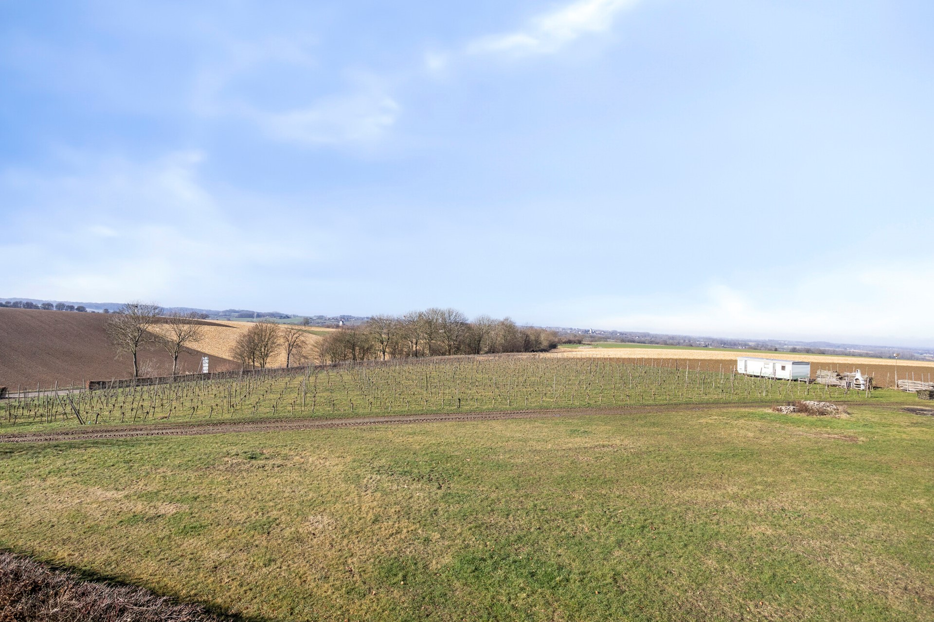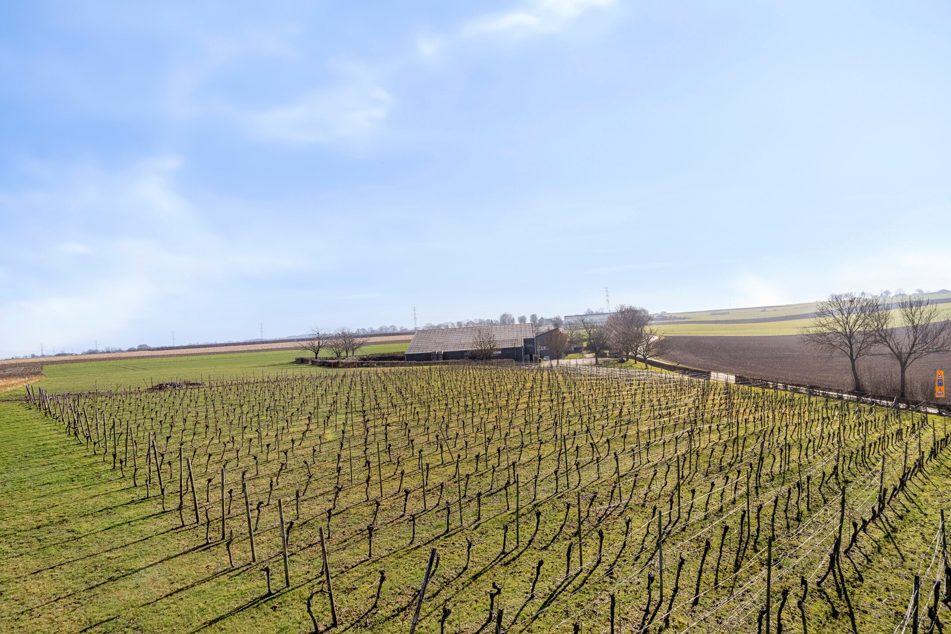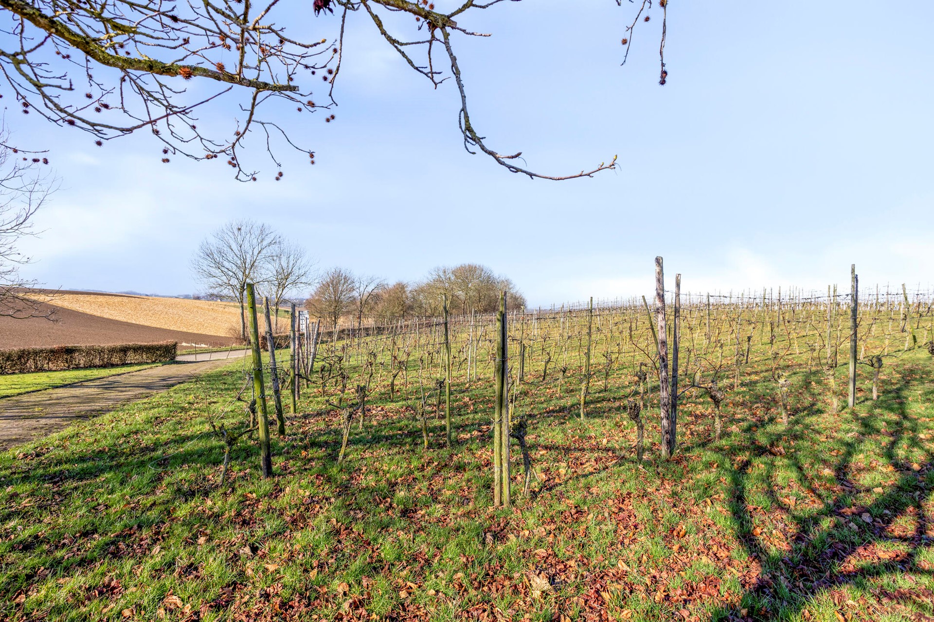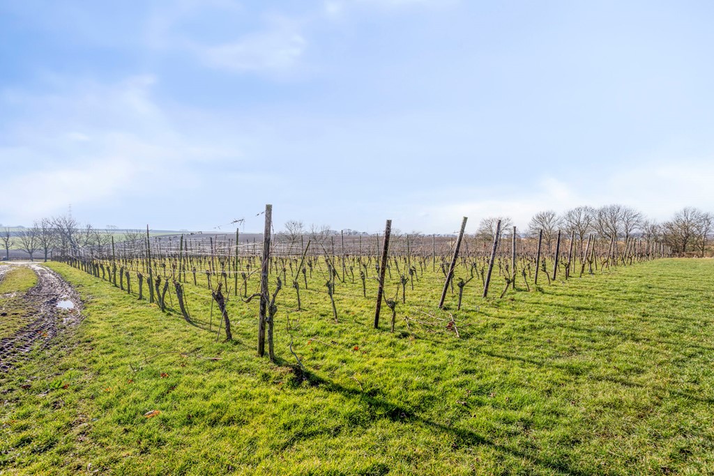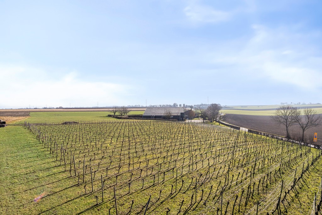 De wijngaard van ca. 0,5 ha ligt fraai op het glooiende perceel en sluit mooi aan bij het open heuvellandschap rondom de locatie. De aanplant bestaat uit drie sterke en veelgebruikte rassen, namelijk de Johanniter en Solaris (wit) en Cabernet Cortis (rood). De rijen zijn overzichtelijk aangelegd en profiteren van