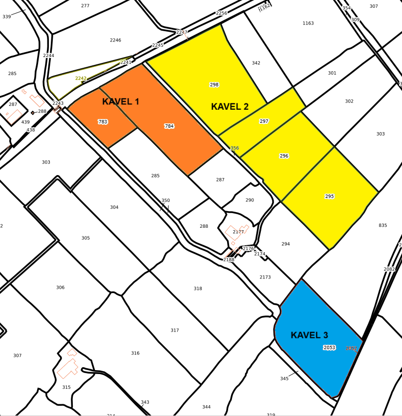 Nummer 783: dit perceel ligt niet aan de openbare weg. Wanneer koper dit perceel via perceelnummer 784 wil ontsluiten, bijvoorbeeld door het realiseren van een dam, komen deze kosten voor rekening van koper.