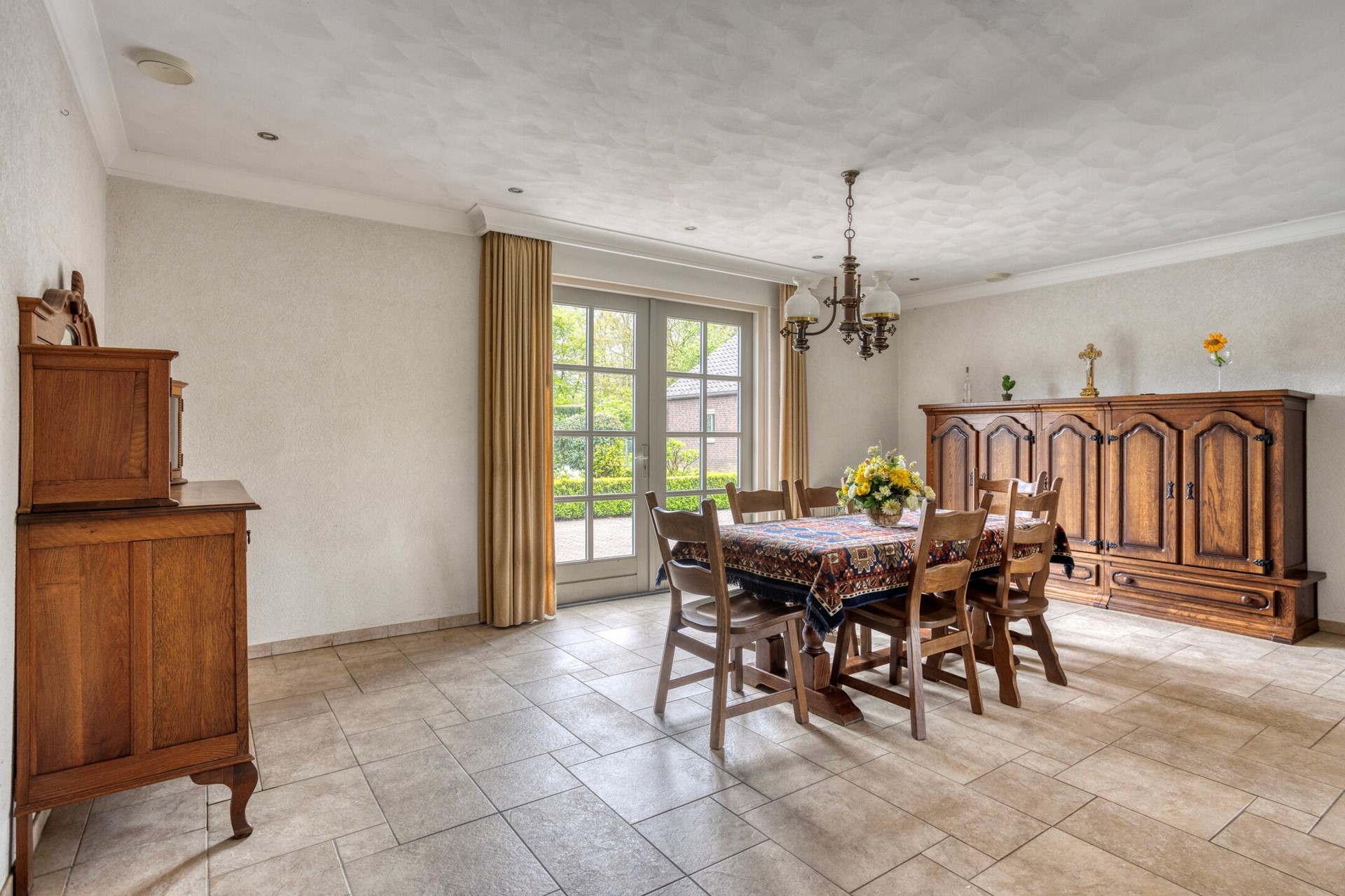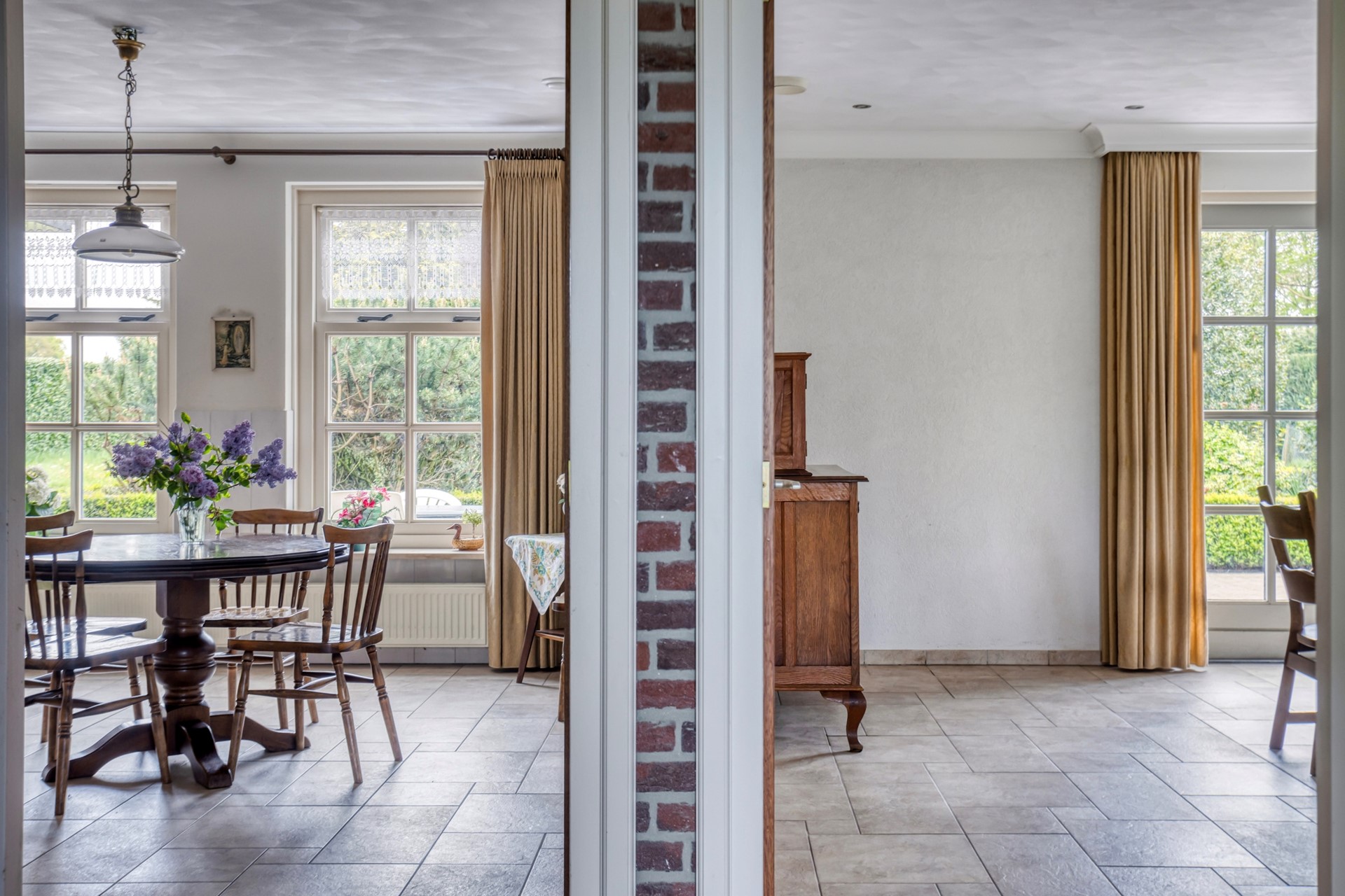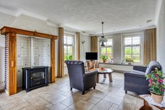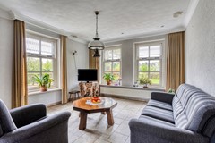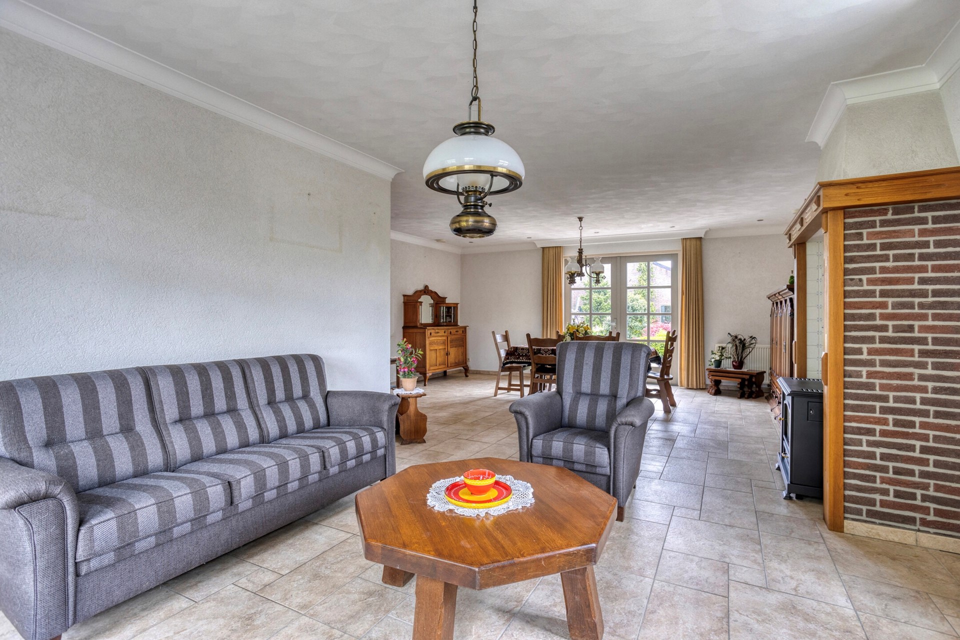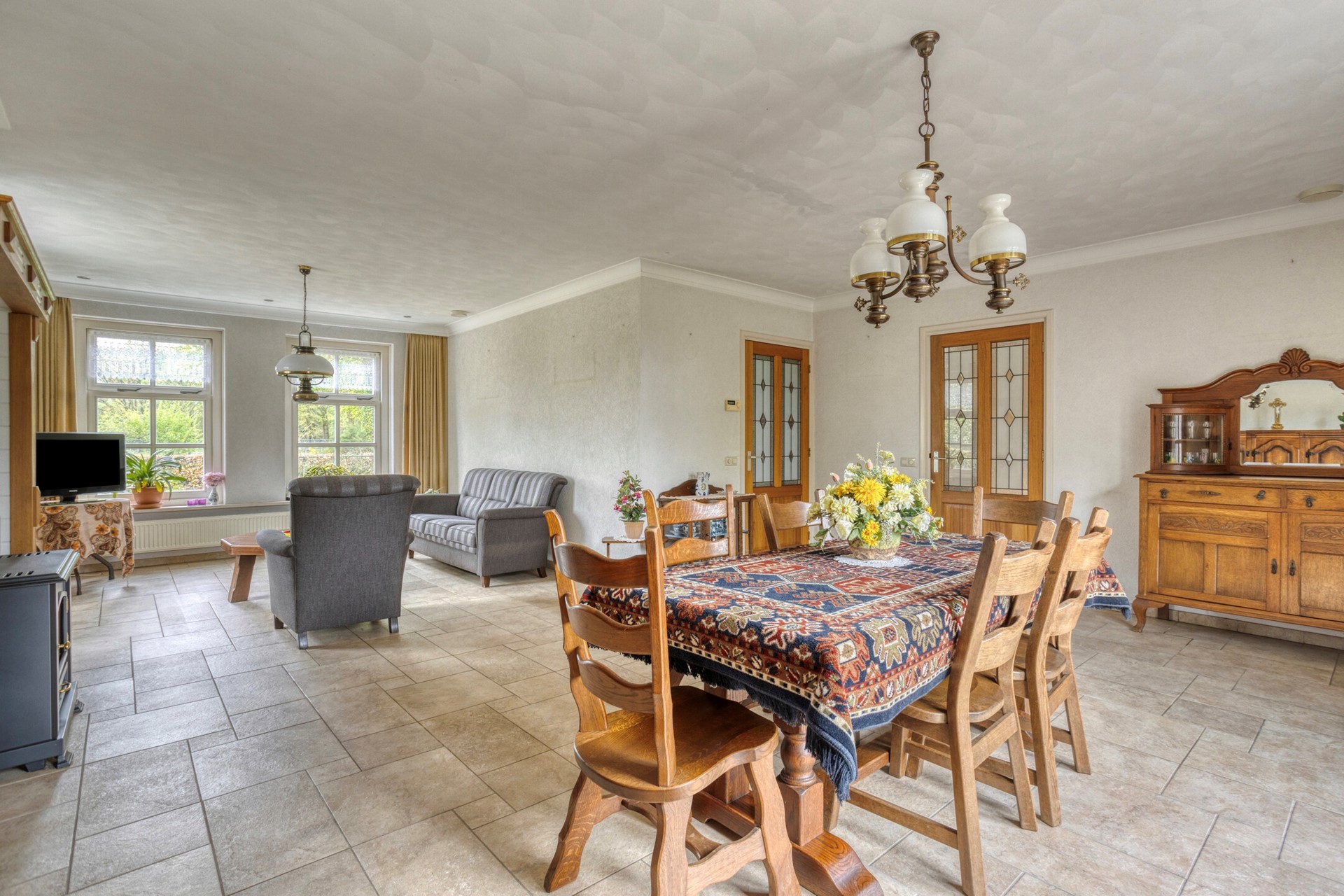 L-vormige woonkamer; de woonkamer is voorzien van openslaande tuindeuren;