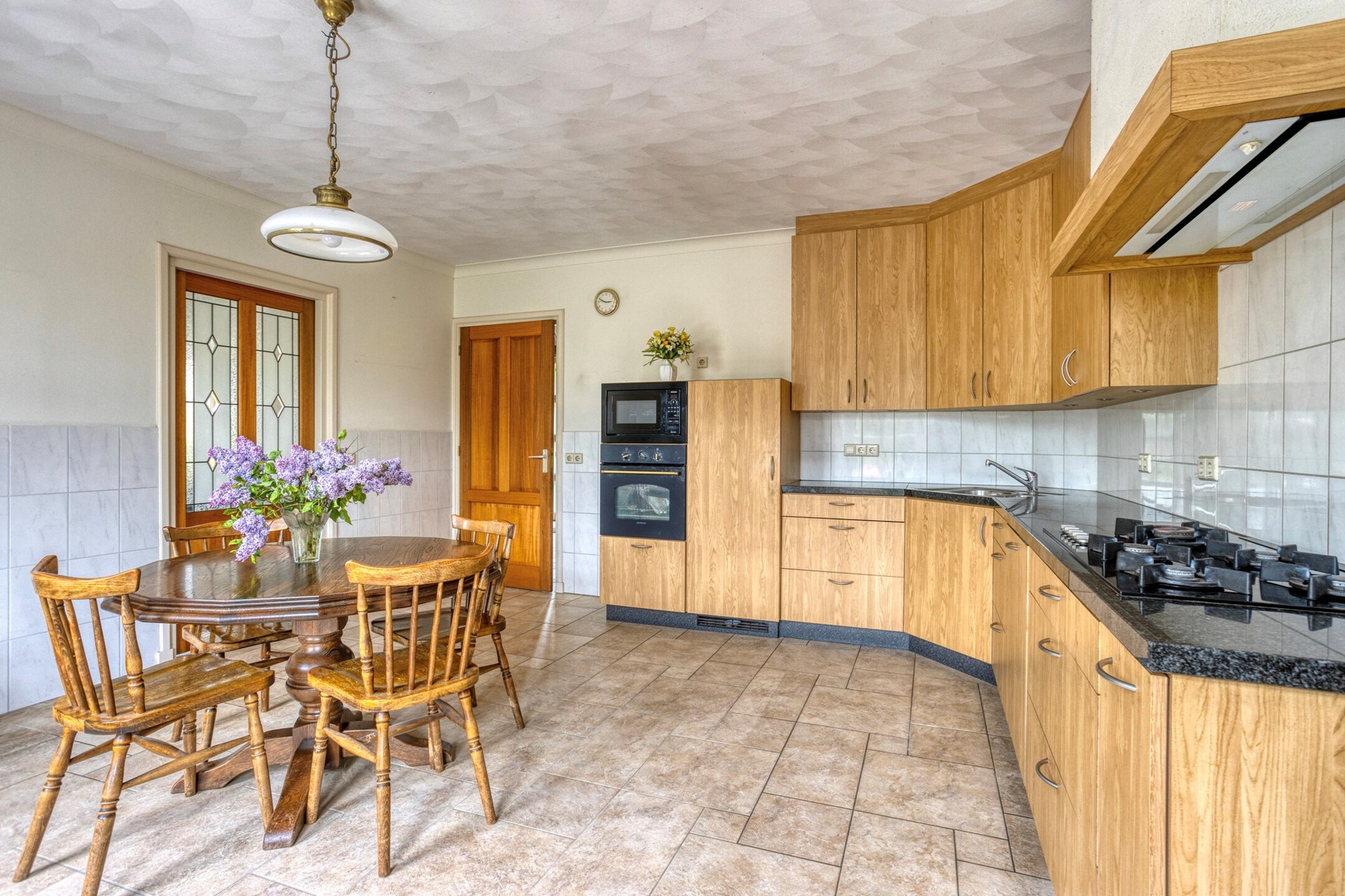 woonkeuken met opstelling keuken voorzien van inbouwapparatuur, zoals vaatwasmachine, oven, magnetron en koelkast met vriesvak en gaskookplaat;