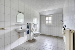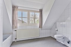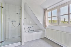 badkamer met ligbad, douche, toilet en dubbele wastafel.