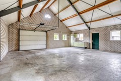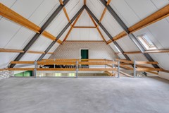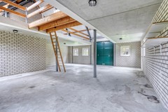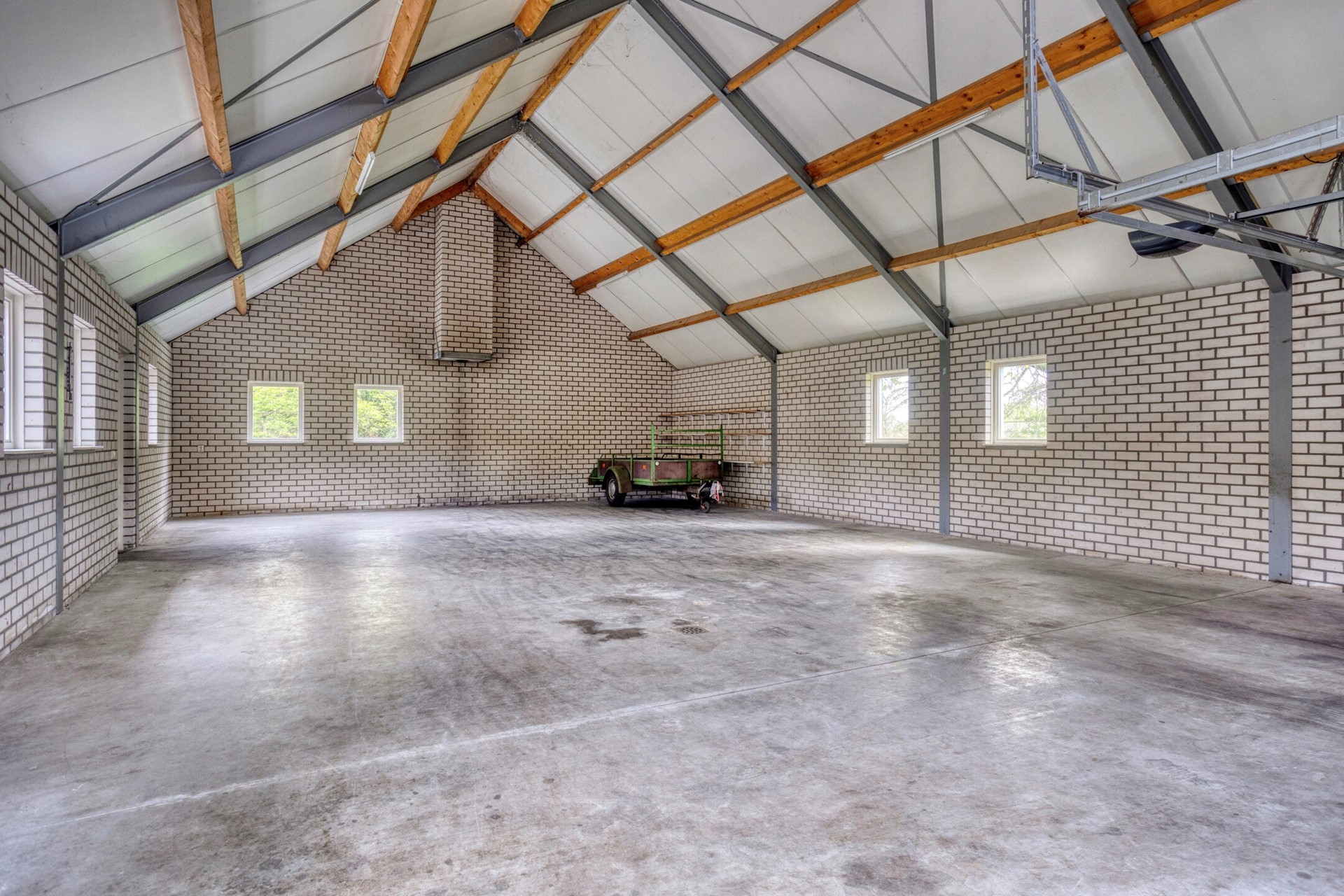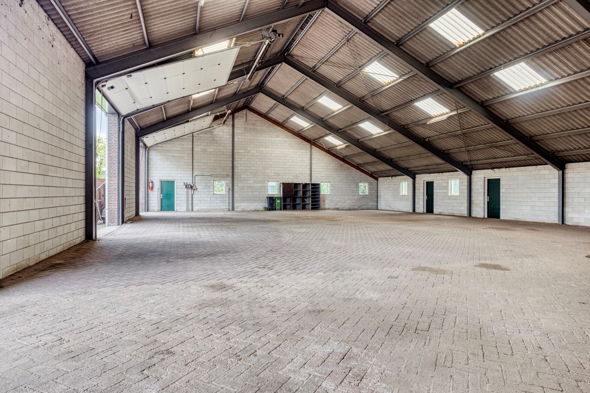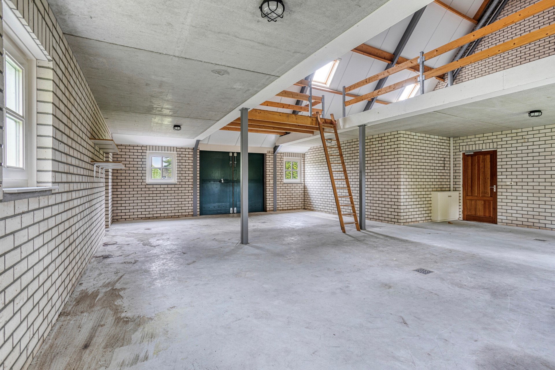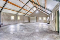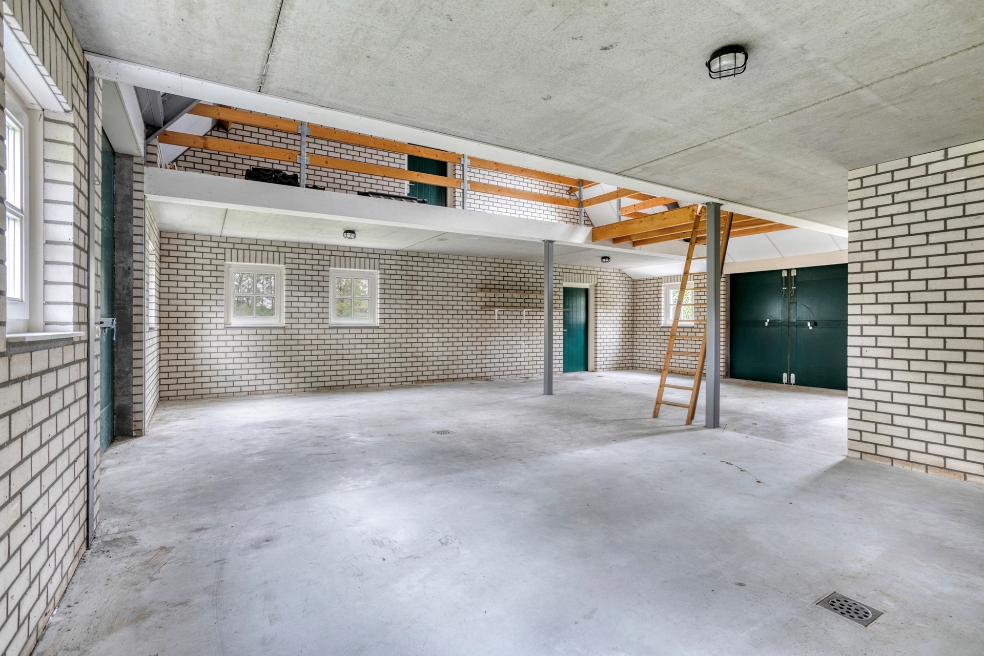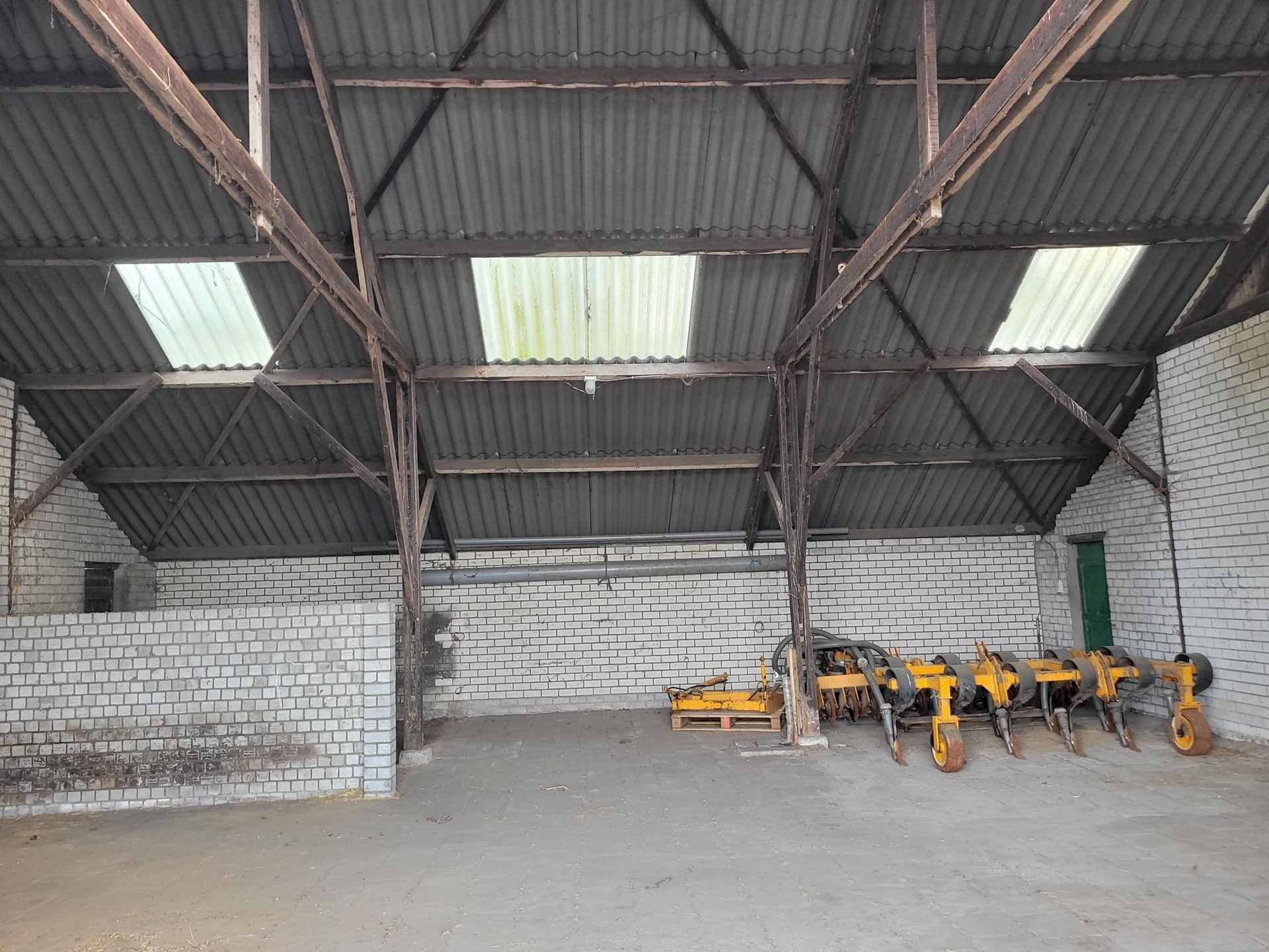 schuur met aan beide (voor en achter)zijde openslaande deuren en een betonnen verdiepingsvloer.