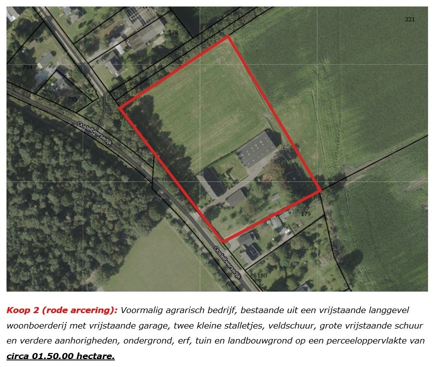 KOOP 2: Voormalig agrarisch bedrijf, bestaande uit een vrijstaande langgevel woonboerderij met vrijstaande garage, twee kleine stalletjes, veldschuur, grote vrijstaande schuur en verdere aanhorigheden, ondergrond, erf, tuin en landbouwgrond op een perceeloppervlakte van circa 01.50.00 hectare