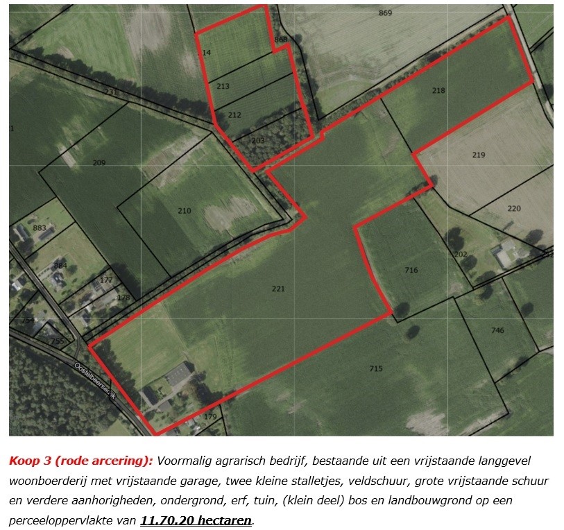 KOOP 3: Voormalig agrarisch bedrijf, bestaande uit een vrijstaande langgevel woonboerderij met vrijstaande garage, twee kleine stalletjes, veldschuur, grote vrijstaande schuur en verdere aanhorigheden, ondergrond, erf, tuin, (klein deel) bos en landbouwgrond op een perceeloppervlakte van 11.70.20 hectaren.