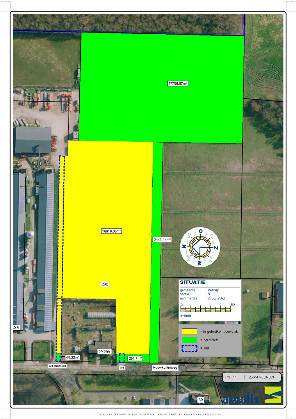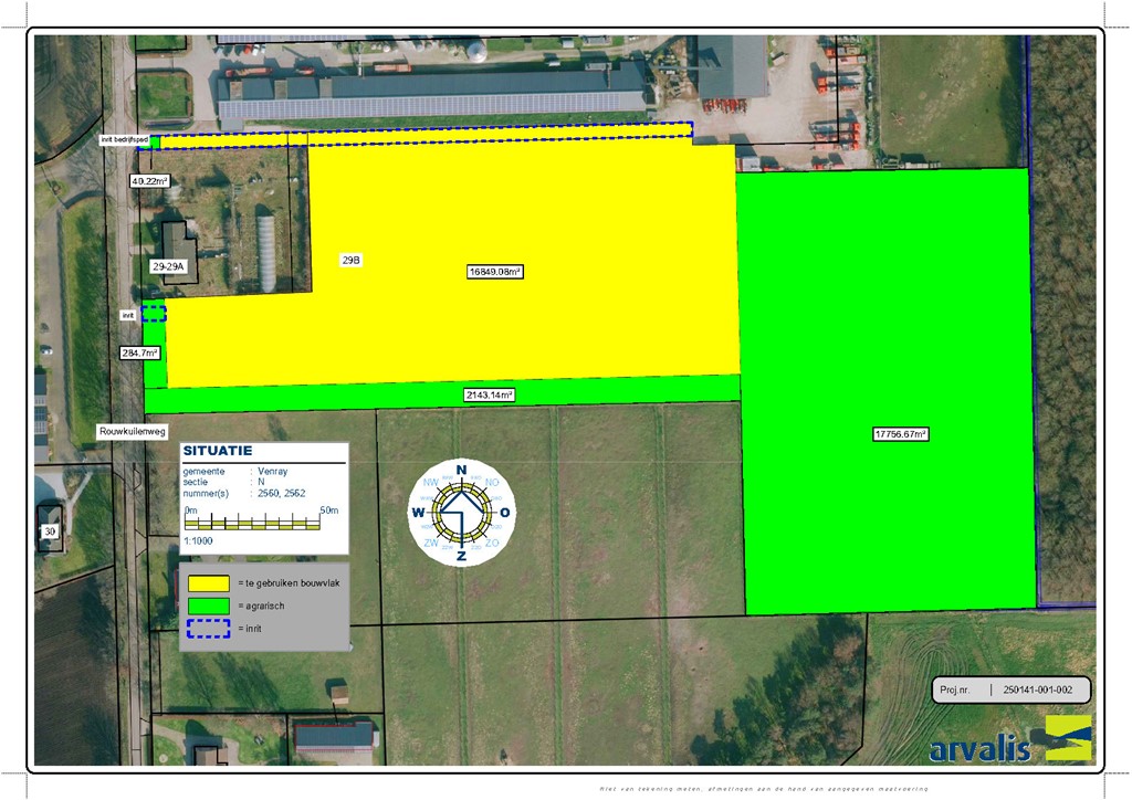 Op twee afbeeldingen wordt met een geel kader het bouwvlak weergegeven en met het groen kader de cultuurgrond. De locatie zal middels twee inritten vanuit de Rouwkuilenweg toegankelijk zijn.