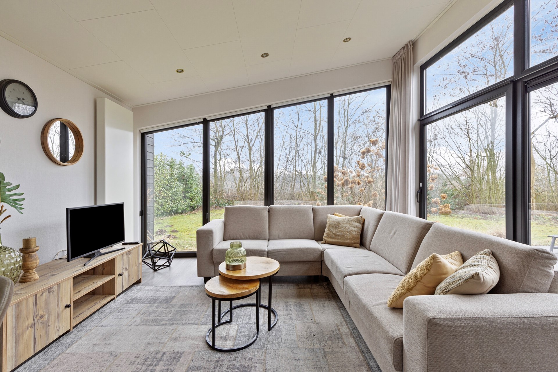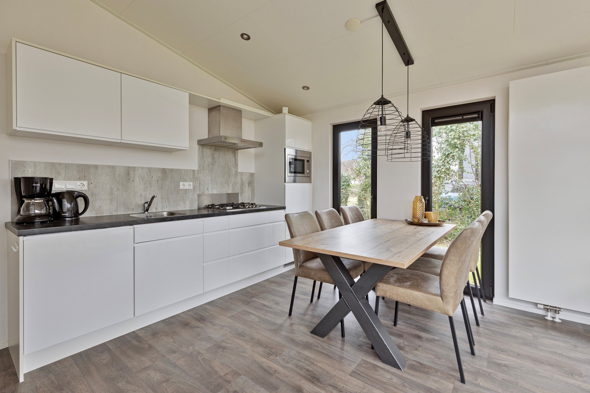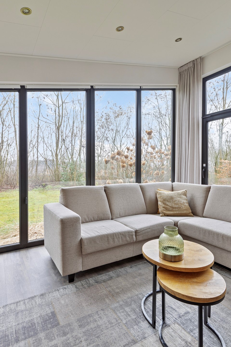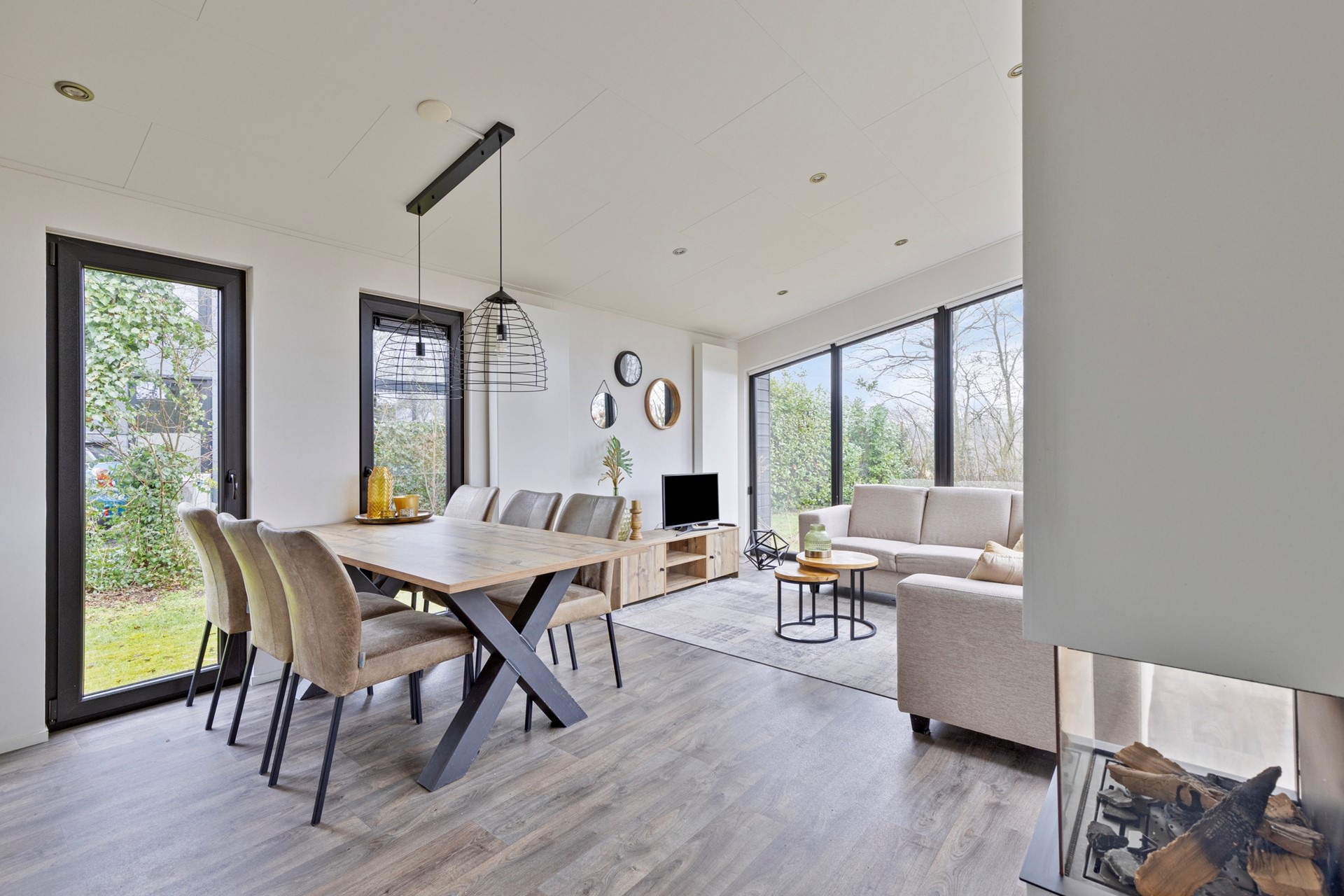 De lichte woonkamer met grote raampartijen geeft een prachtig uitzicht op de tuin en zorgt voor een natuurlijke verbinding met buiten. De open keuken is strak vormgegeven en voorzien van moderne inbouwapparatuur. De eethoek vormt een sfeervolle plek voor lange avonden tafelen.