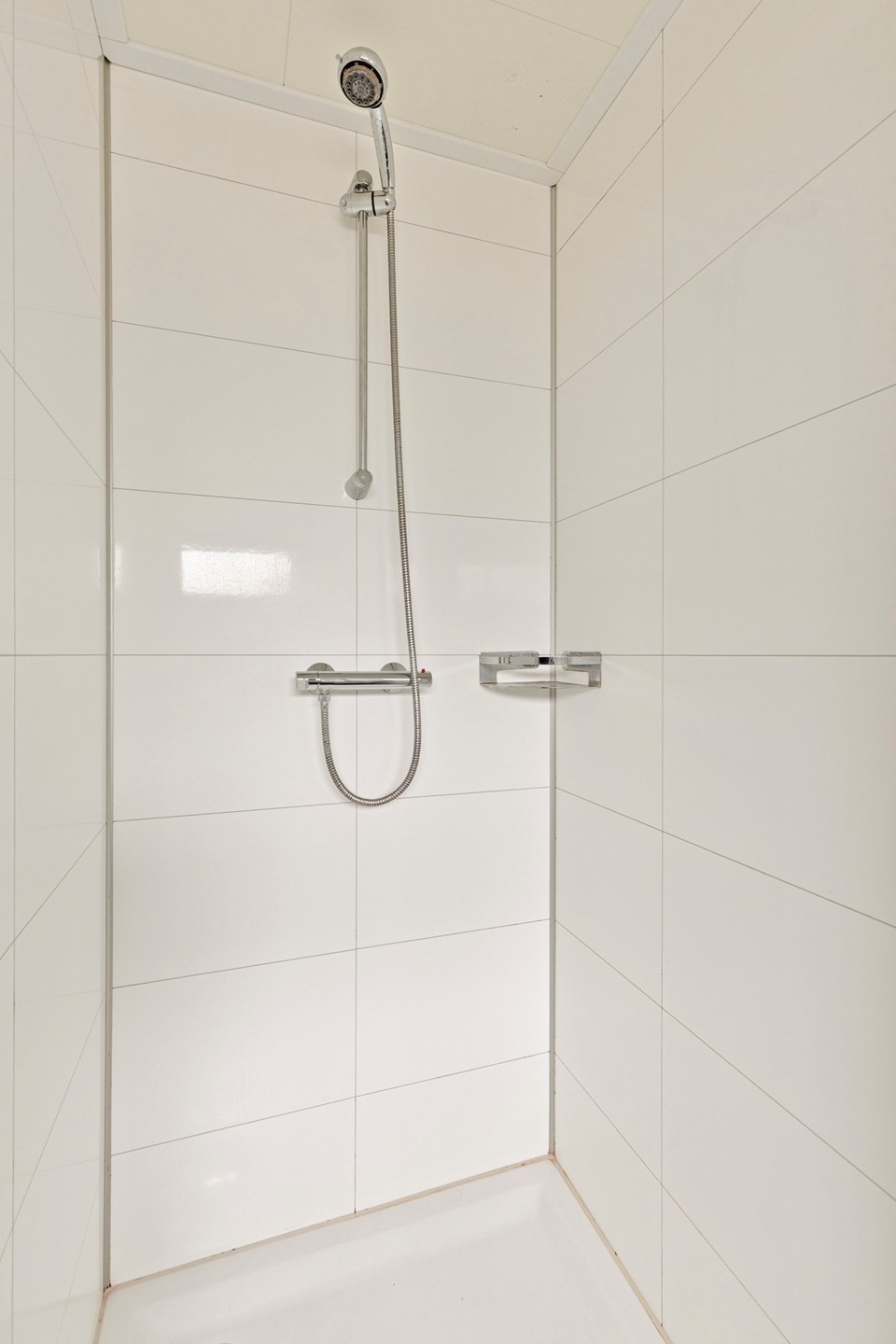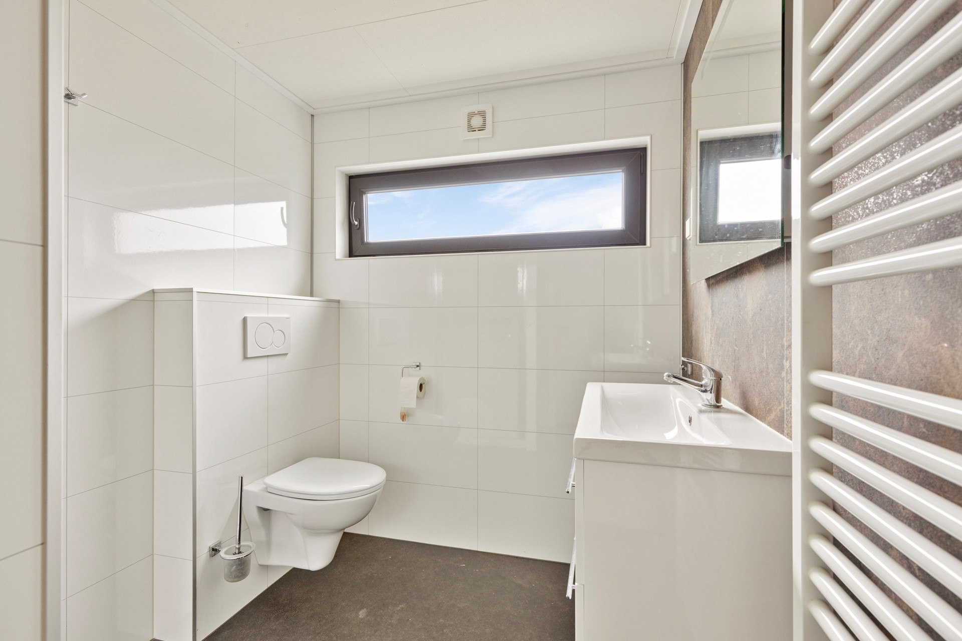 De moderne badkamer is uitgevoerd in tijdloze materialen en voorzien van een ruime douche, wastafelmeubel en toilet. Alles straalt rust en comfort uit.