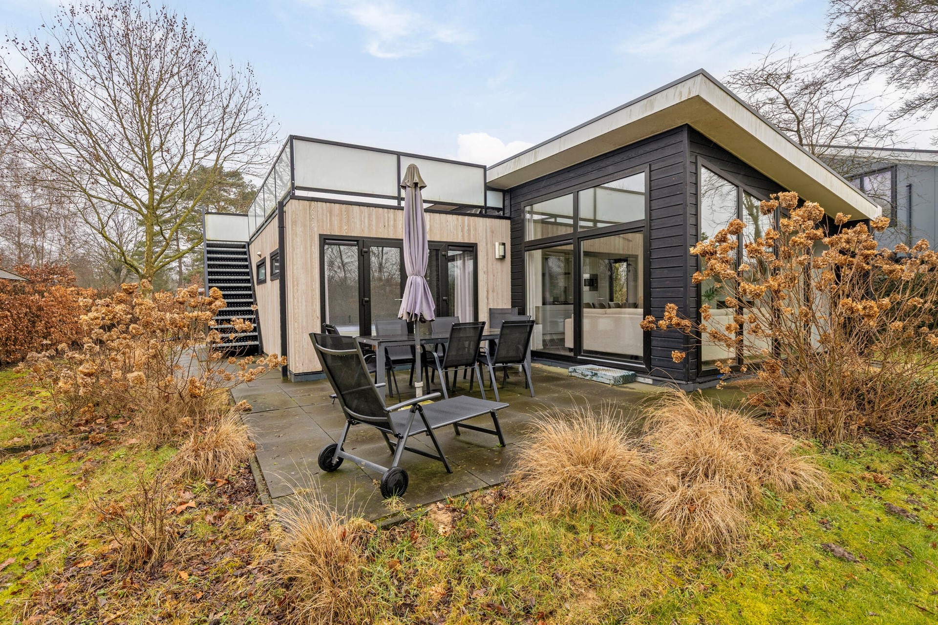 Het royale terras is een heerlijke plek om te ontspannen, te eten of te genieten van de zon. Via de trap bereik je het dakterras, hier kun je heerlijk genieten van zon. De vrijstaande berging biedt extra opslagruimte voor fietsen, tuingereedschap of hobbyspullen.