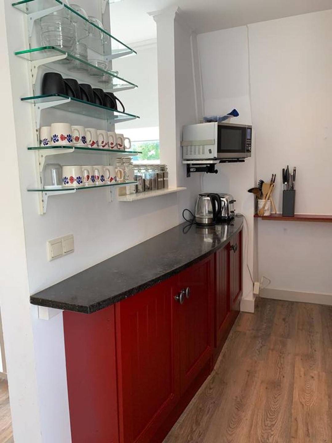This spacious (122 m2) and light 3 bedroom and extra work space house has 2 levels, 1 1/2 bathrooms, large dining, kitchen with all equipment and appliances built in, is next to the balcony with free view. The light living room with large windows has airco. The pittoresque buildings across the street and the waterfront are a gem in this village. There is a separate space for work/study purposes, a large bathroom, laundry area and the master bedroom on this level as well. On the toplevel is a large bedroom with a TV room and an extra room with a pantry. There is a small bathroom with a small shower and toilet as well. Shops, public transport and the highway to Amsterdam or to the North side of The Netherlands are on a 3 minute drive as well as the very center of Amsterdam within 15.