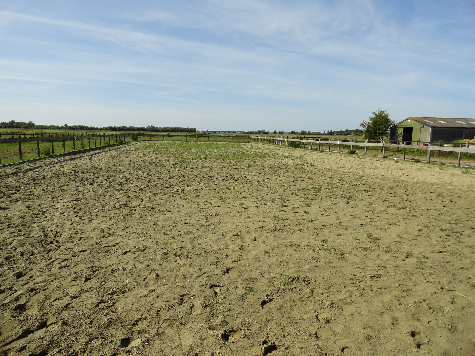 De paardenbak is voorzien van een goed zandbed en rondom hardhouten palen en hardhouten planken paardenbakafrastering.