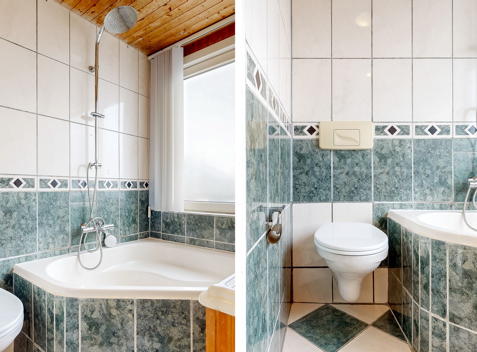 De badkamer is uitgevoerd met een royaal hoekbad met thermostaatkraan, regen- en handdouche, zodat je ook in bad kunt douchen. Er is een wastafelmeubel met houten onderkast, spiegel en verlichting. Het wandcloset en de designradiator maken de inrichting van deze badkamer compleet. Het royale raam zorgt voor lichtinval en ventilatie.