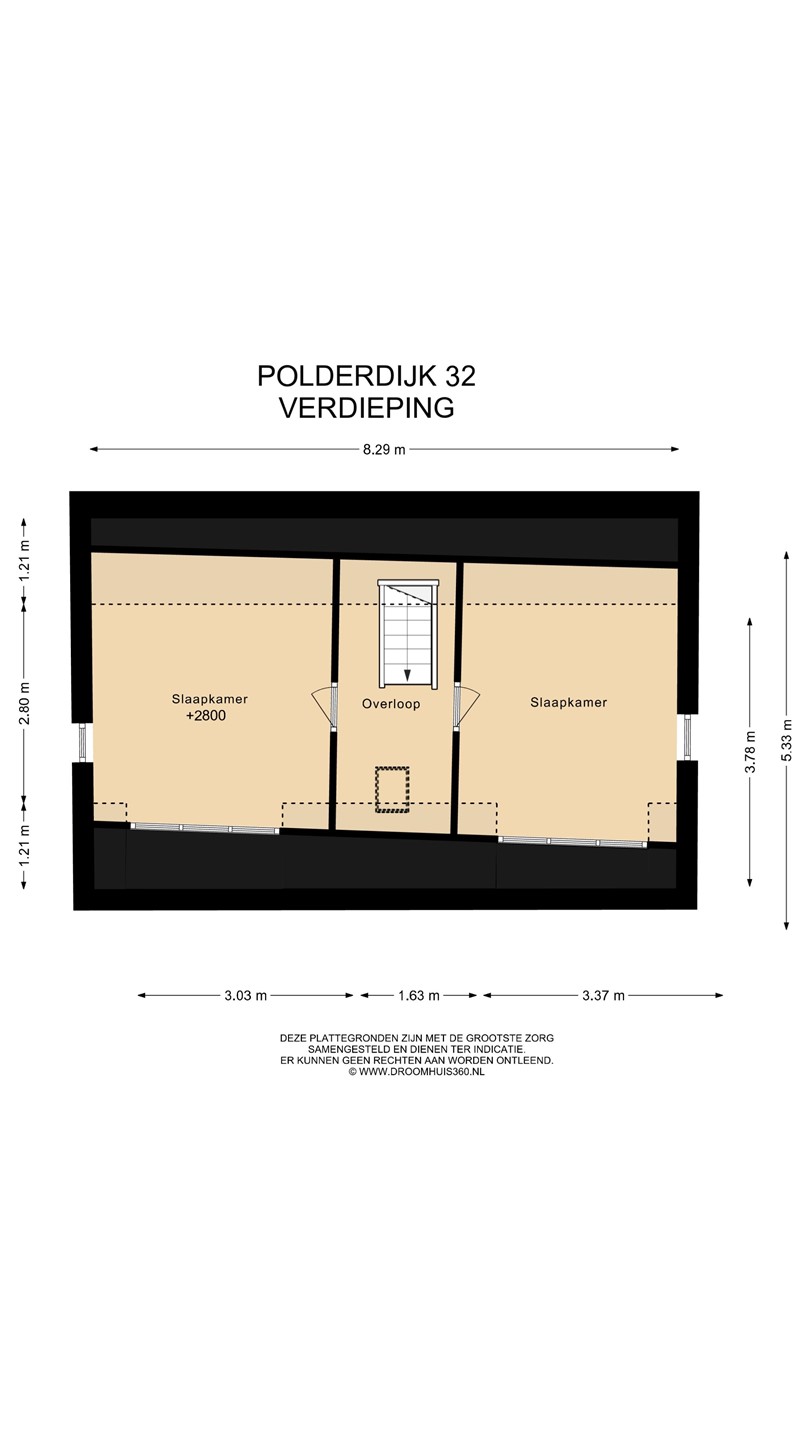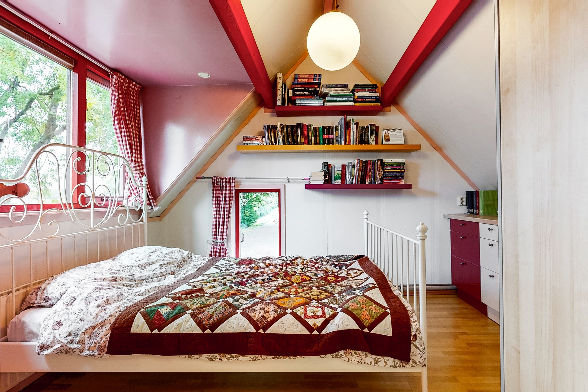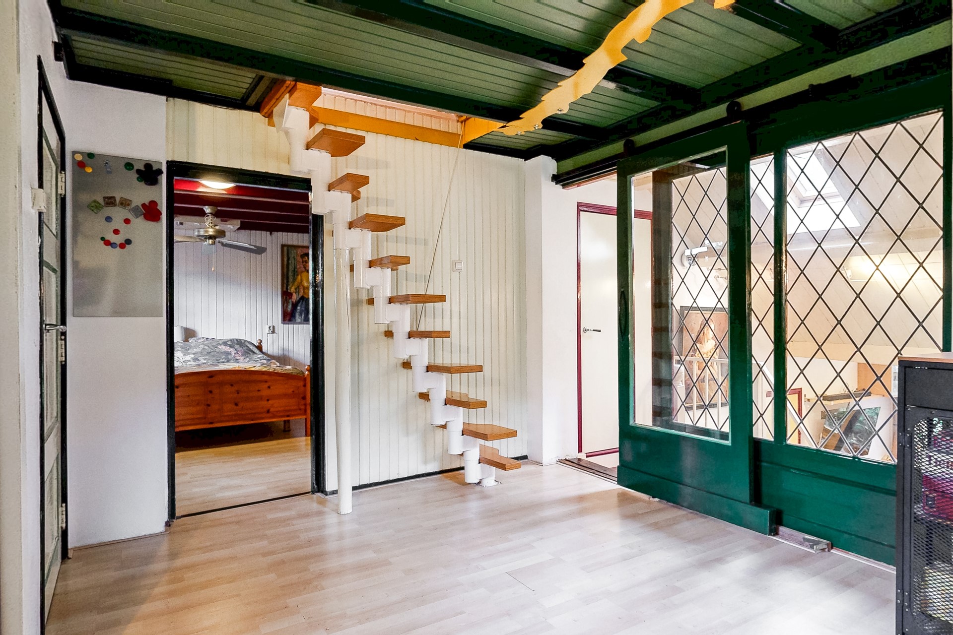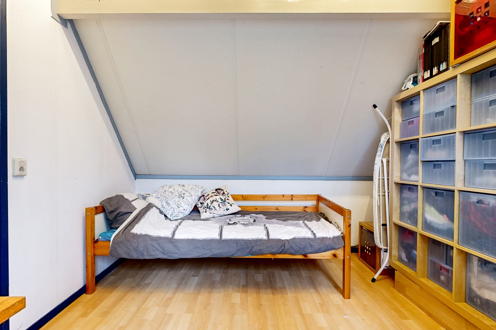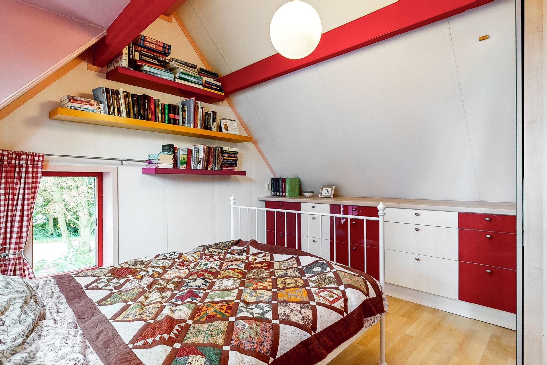 Een stalen trap met houten treden brengt je vanuit de opkamer (dijkniveau) naar de slaapverdieping. In 2004 heeft deze verdieping een volledig nieuw dak gekregen inclusief isolatie en twee dakkapellen met HR+-glas.