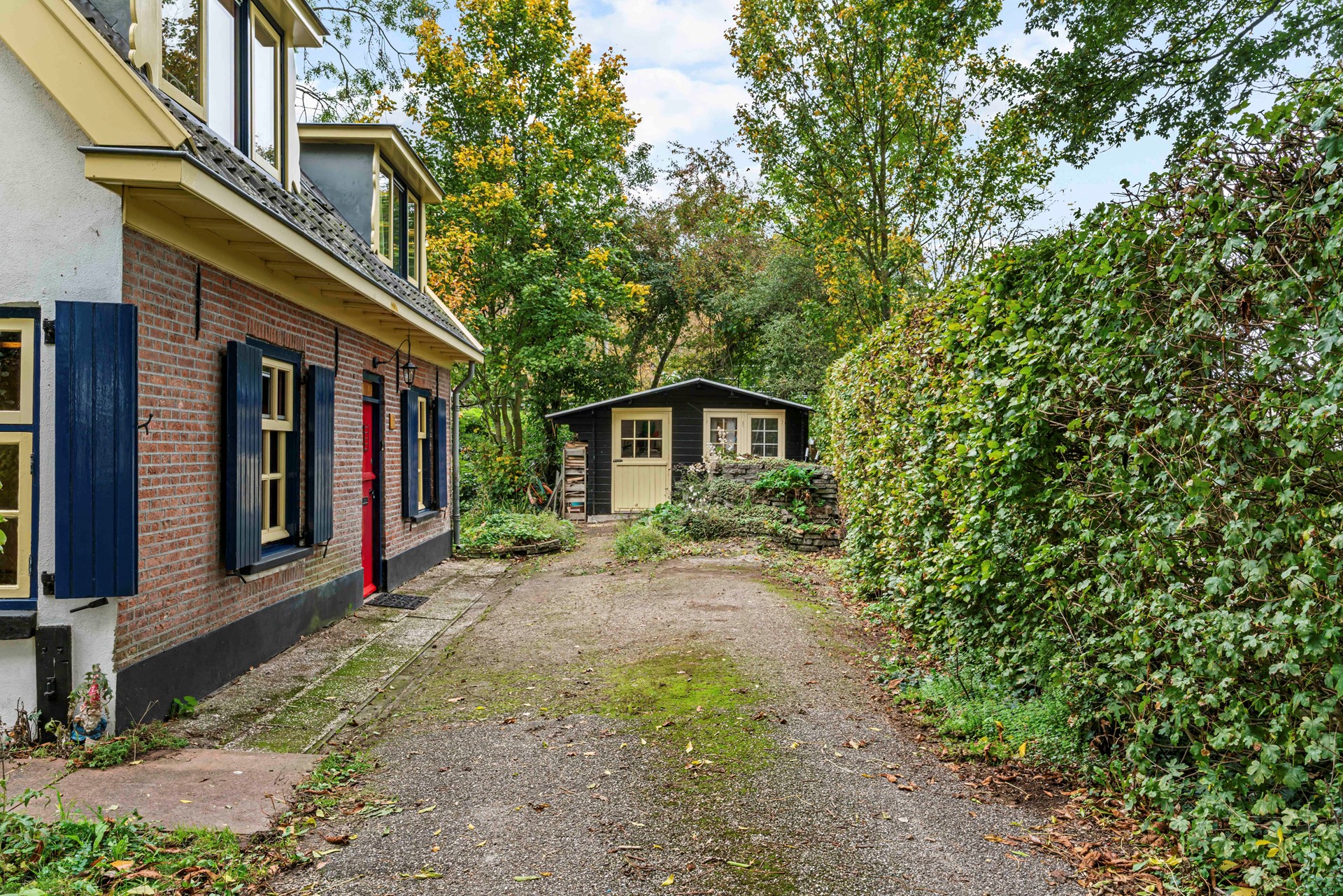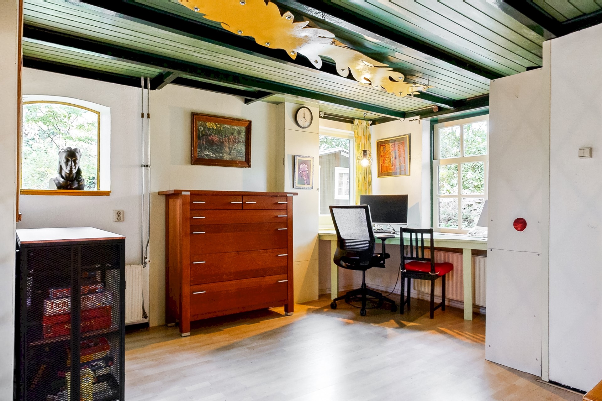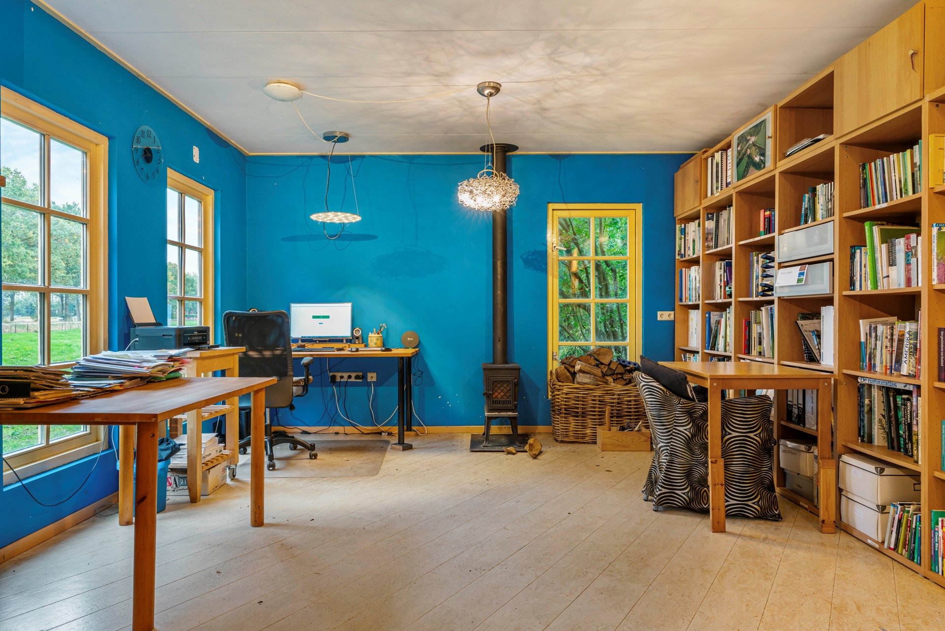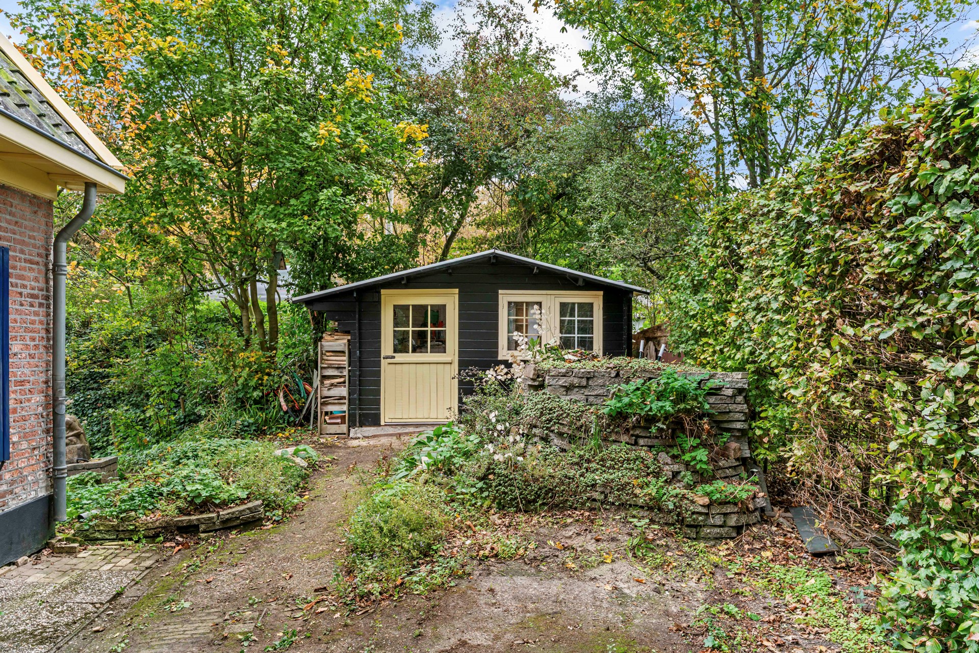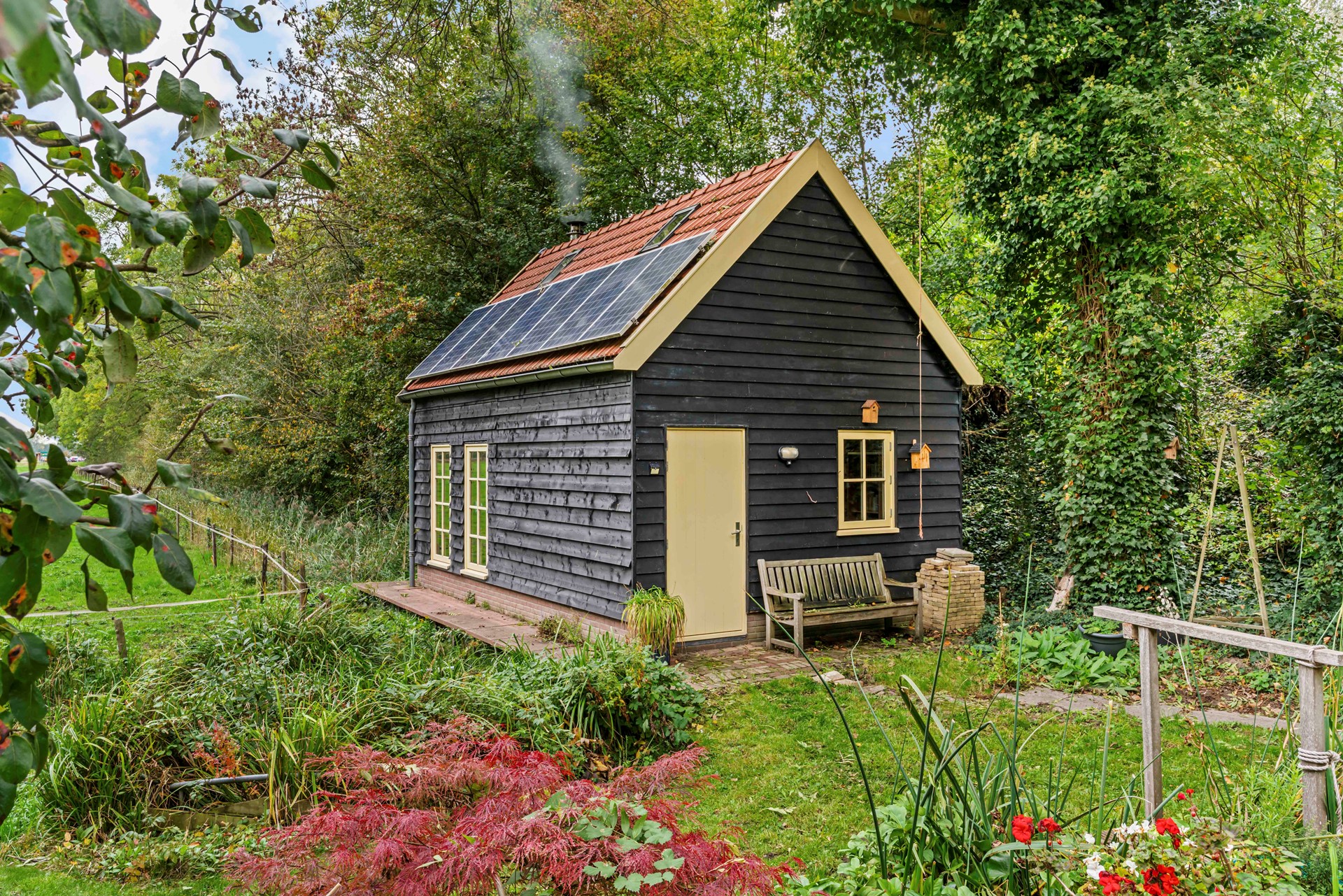 Het stijlvolle bijgebouw achterin de tuin is in 2007 gebouwd en volledig voorzien van isolatie en dubbel glas. De gevel is opgetrokken met een metselwerk voet en daarboven houten potdekselwerk gevels. Het dak is uitgevoerd met rode pannen, waarop de 7 zonnepanelen zijn aangebracht. Binnen vind je een royale verblijfsruimte met een kurkvloer, houtwerk wanden en een gipsplaten plafond. De roederamen bieden een heerlijk uitzicht op het aangrenzende weiland en de paarden, die hier vaak grazen. De ruimte is voorzien van elektra en de houtkachel van “Jotul” verzorgt de verwarming. Via een vlizotrap is de royale zolder op stahoogte bereikbaar voorzien van twee Velux-dakvensters. Op dit moment doet dit bijgebouw dienst als kantoor, maar andere gebruiksmogelijkheden zijn natuurlijk denkbaar. Door er water en riolering naar toe te brengen zou je er zelfs een woonruimte of bed and breakfast van kunnen maken.