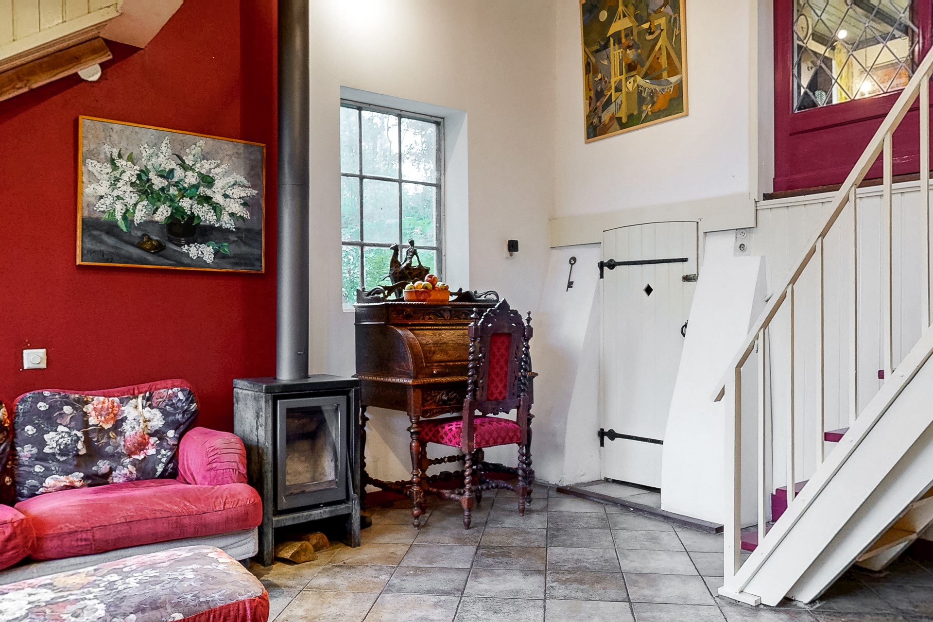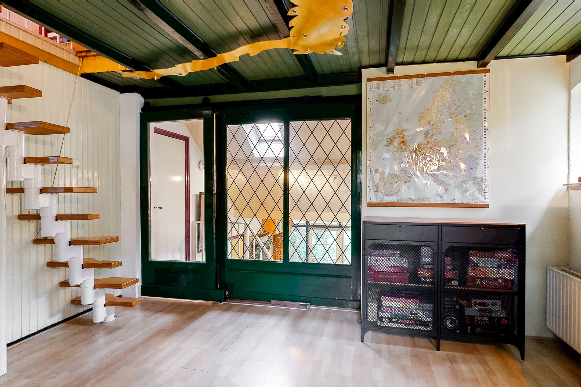 Vanuit de hal stappen we binnen in de opkamer van het huis. Leuk detail: de authentieke toegangsdeur is de voormalige kelderdeur van Hotel New York van de Holland Amerikalijn, een stukje Rotterdamse geschiedenis in de Betuwe. De opkamer is ruim van formaat en op dit moment ingericht als werkplek. Vanzelfsprekend zijn andere gebruiksmogelijkheden ook denkbaar. Het vaste bureau is strategisch gepositioneerd ter hoogte van de ramen in de voor- en zijgevel, zodat je een aangenaam uitzicht hebt op de dijkzijde en de zijtuin. Het balkenplafond, de paneeldeuren en de authentieke ramen houden het verhaal van vroeger levend. De glas-in-lood pui met schuifdeur vormt de transparante scheidingswand met het lager gelegen woongedeelte.